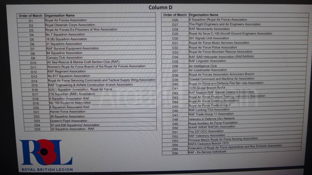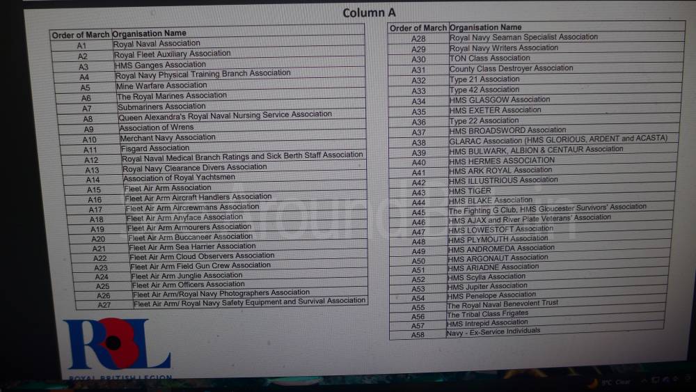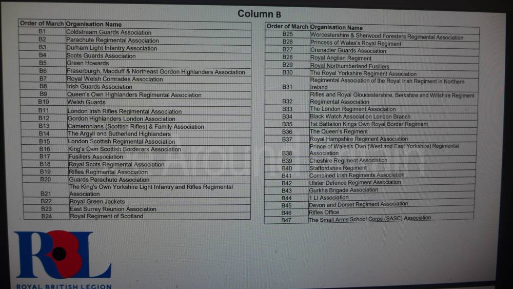 For local events across the UK, the number of marching bands varies widely. For example, local services often feature single community or military cadet bands, such as the Poole Sea Cadets Marching Band, The Waterloo Band and Bugles of the 7 Rifles, or the Band of The Duke of Lancaster's Regiment. "