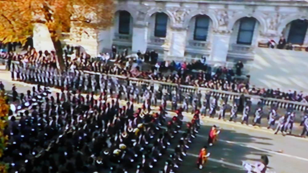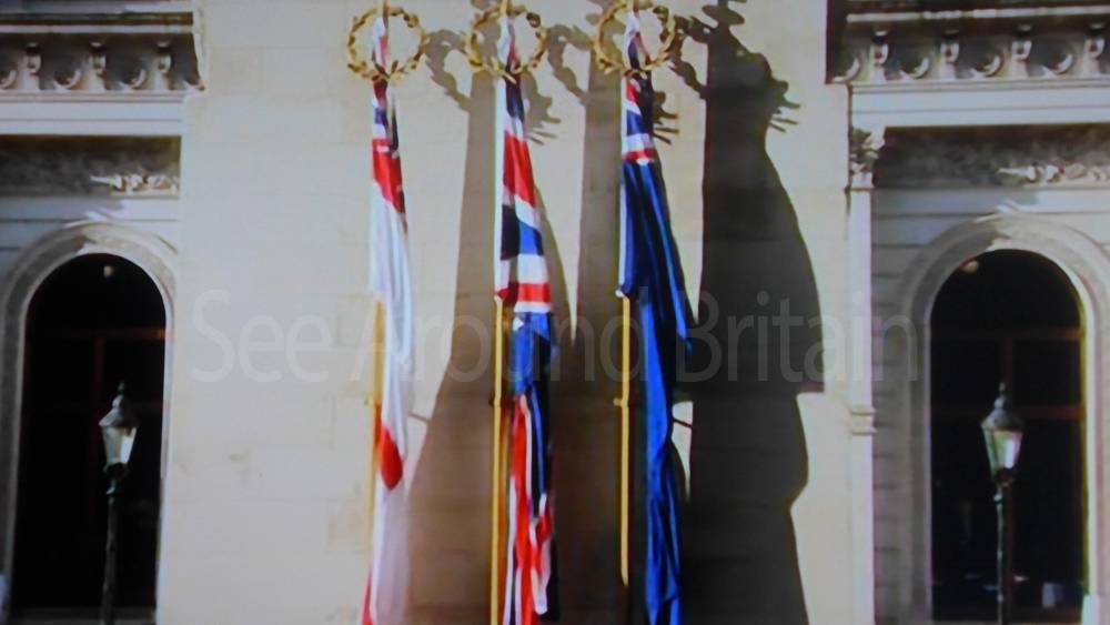 The service has its origins in the 1920s and has changed little in format since. To open the ceremony, a selection of national airs and solemn music representing each of the nations of the United Kingdom are played by massed bands and pipes. A short religious service is held with a two-minute silence commencing when Big Ben chimes at 11 am. Following this, wreaths are laid by the King and members of the royal family, senior politicians representing their respective political parties, and High commissioners from the Commonwealth of Nations. After the wreath-laying ceremony, a march-past of hundreds of veterans processes past the Cenotaph. The ceremony has been broadcast nationally by the BBC on radio since 1928 and was first broadcast by the BBC Television Service in 1937.[2]
