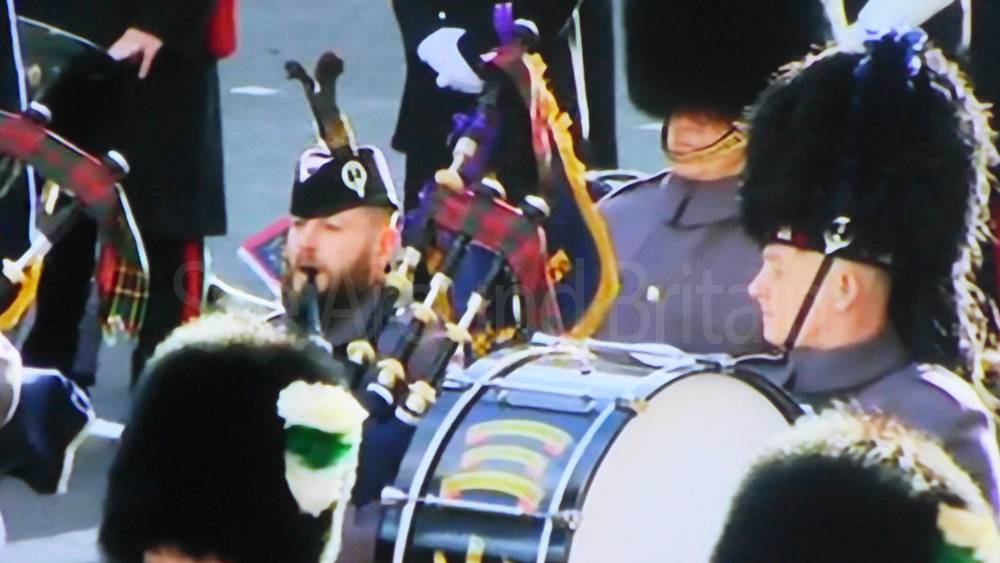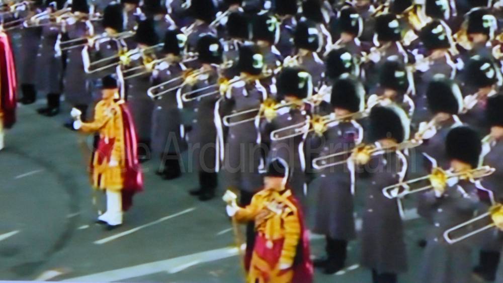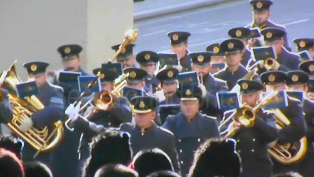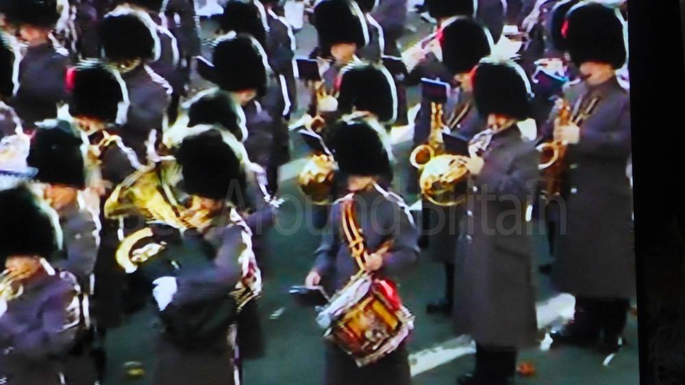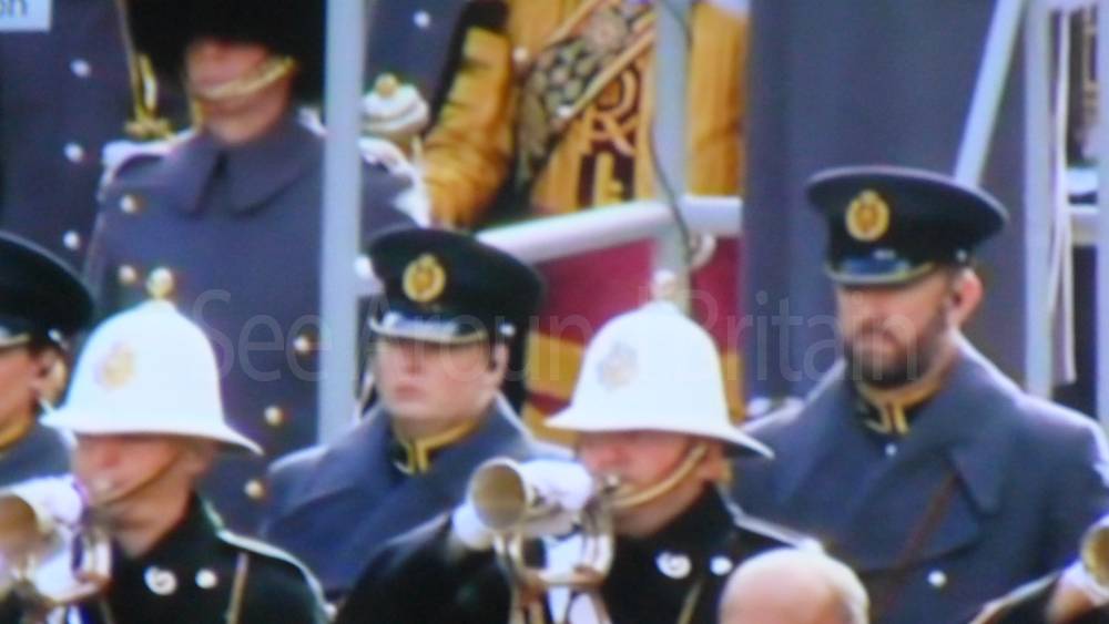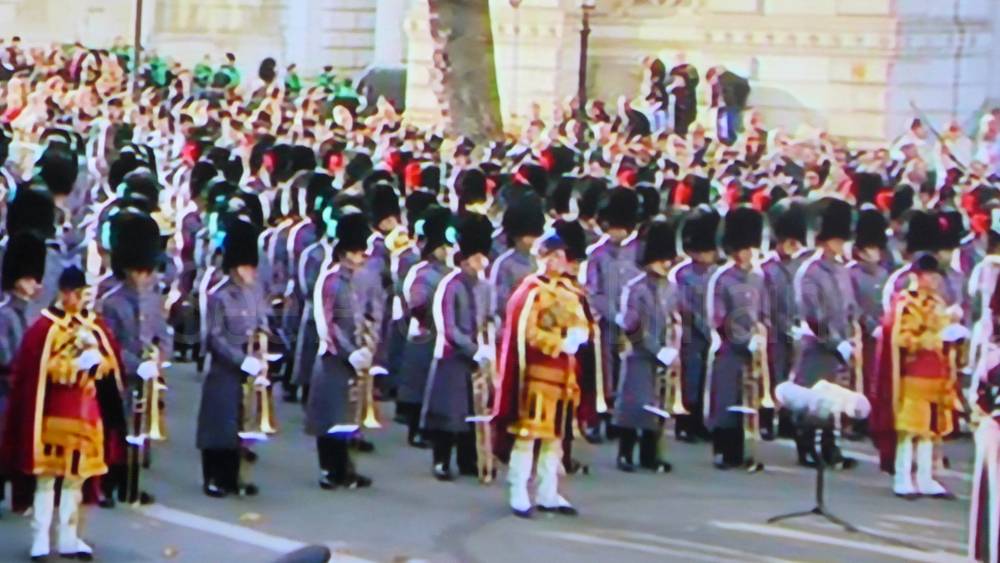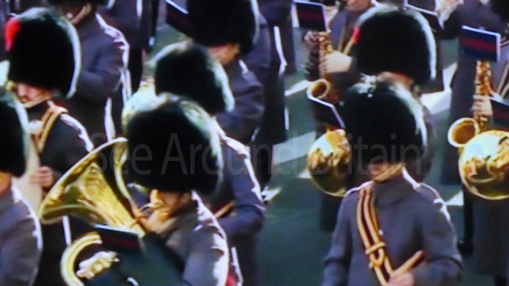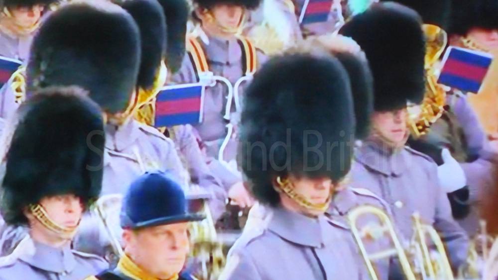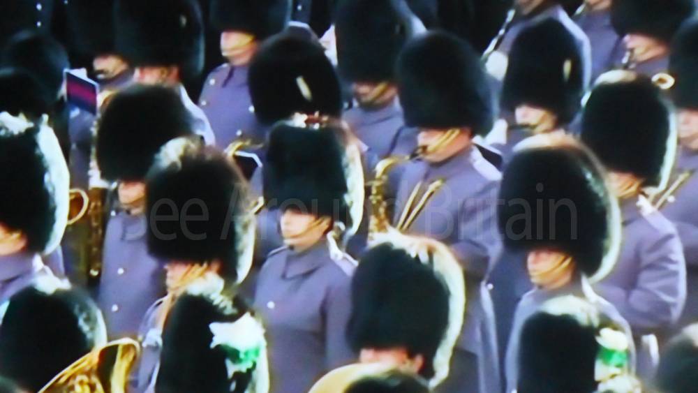 The ceremony begins at precisely 10:36 a.m. with a programme of music known as "the Traditional Music", a sequence beginning with "Rule Britannia!" which has remained largely unchanged since 1930.[12] This comprises a selection of National Airs and solemn music representing the four nations of the United Kingdom performed by the massed bands of the Household Division interposed Pipes and Drums from the Highlanders 4th Battalion The Royal Regiment of Scotland. The massed band represents the four nations; the Band of the Grenadier Guards, Band of the Coldstream Guards, Band of the Scots Guards and the Band of the Irish Guards.[13][14] "