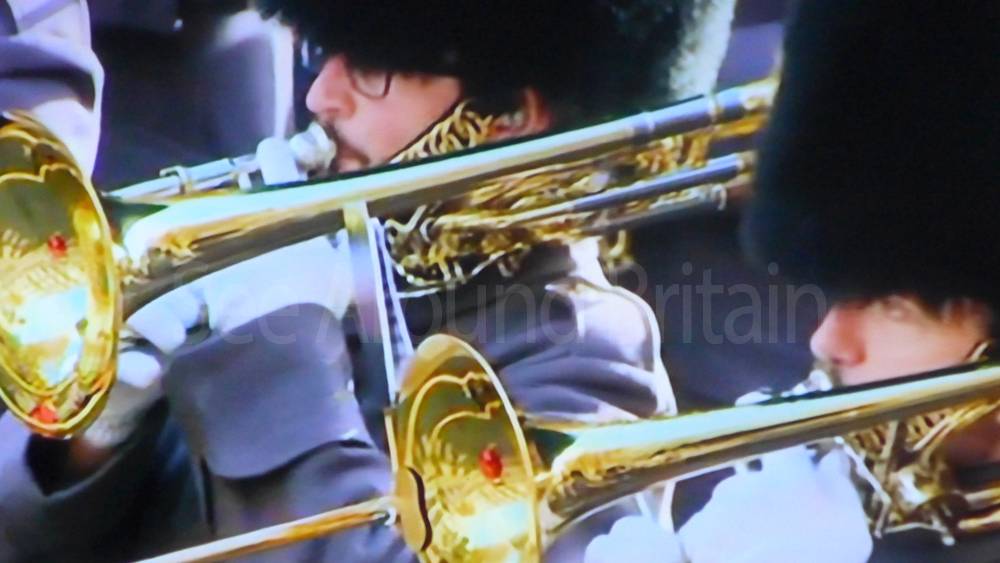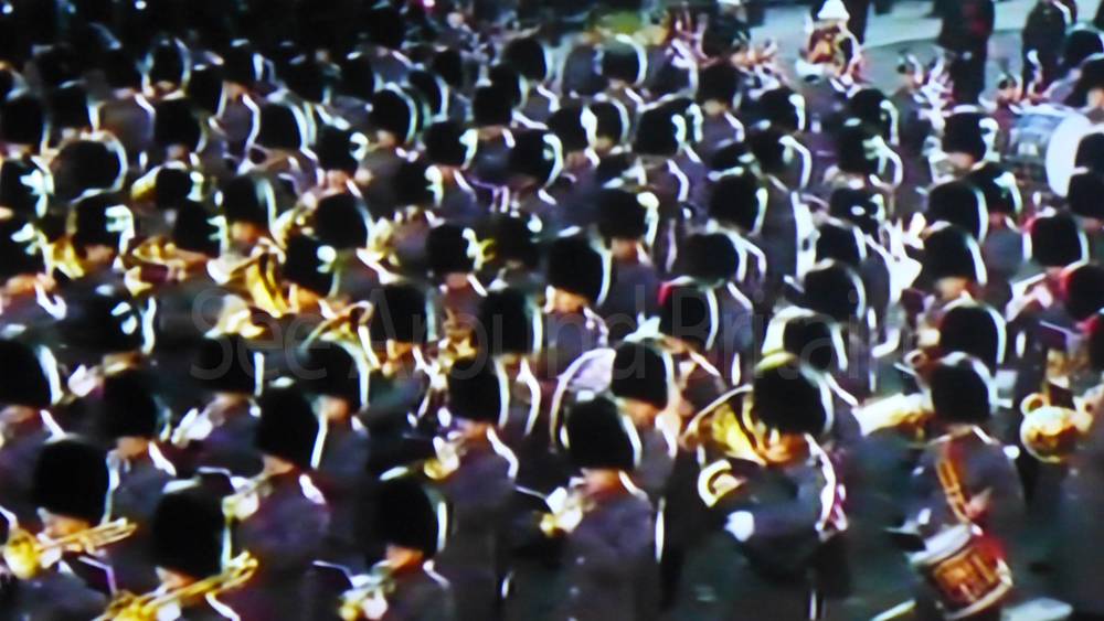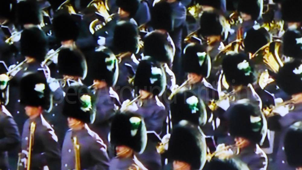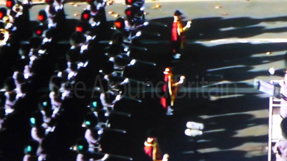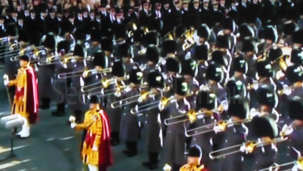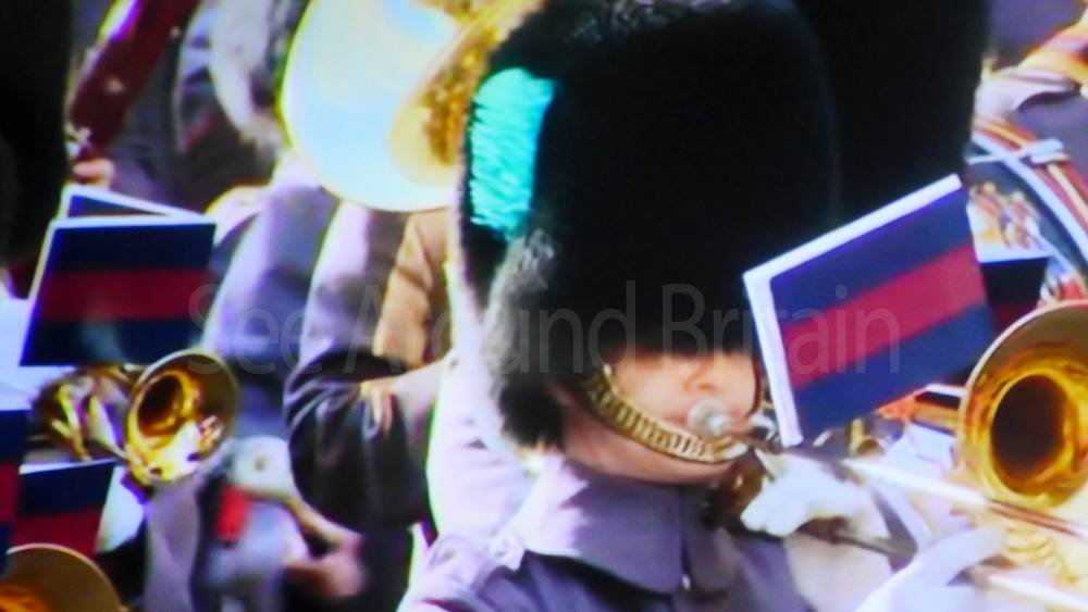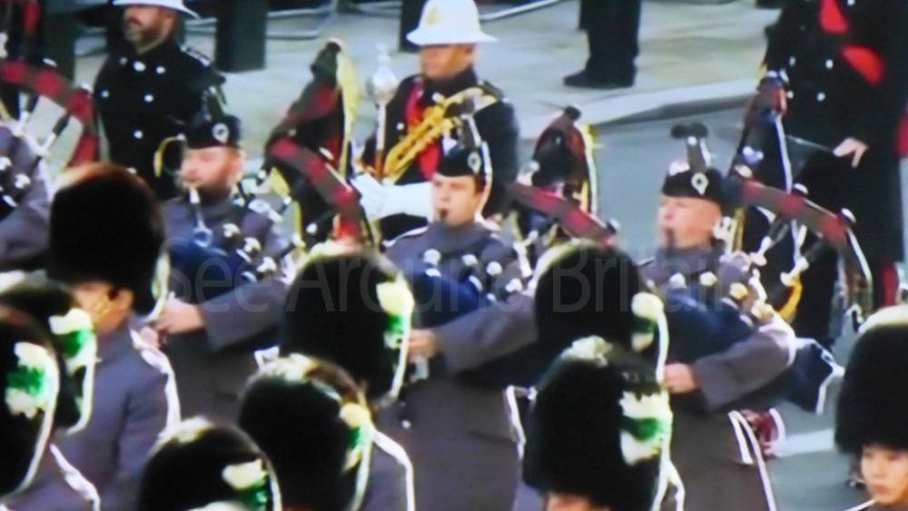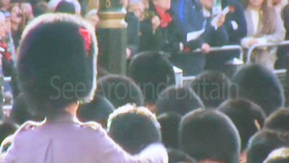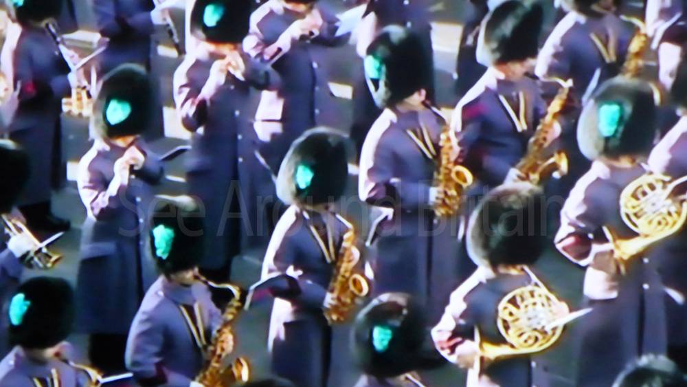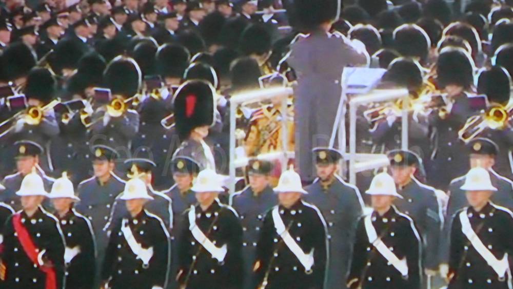 The ceremony begins at precisely 10:36 a.m. with a programme of music known as "the Traditional Music", a sequence beginning with "Rule Britannia!" which has remained largely unchanged since 1930.[12] This comprises a selection of National Airs and solemn music representing the four nations of the United Kingdom performed by the massed bands of the Household Division interposed Pipes and Drums from the Highlanders 4th Battalion The Royal Regiment of Scotland. The massed band represents the four nations; the Band of the Grenadier Guards, Band of the Coldstream Guards, Band of the Scots Guards and the Band of the Irish Guards.[13][14] "