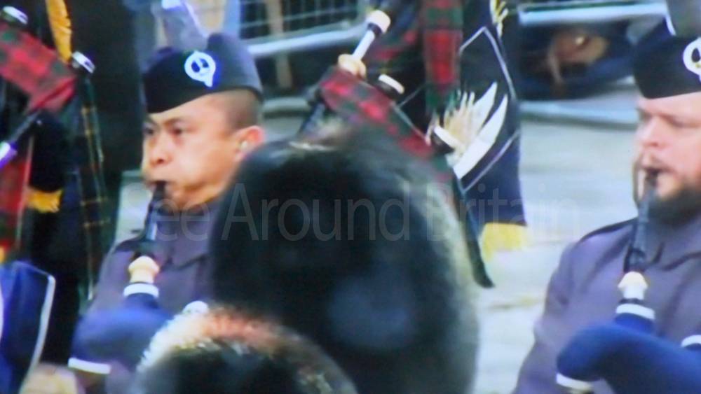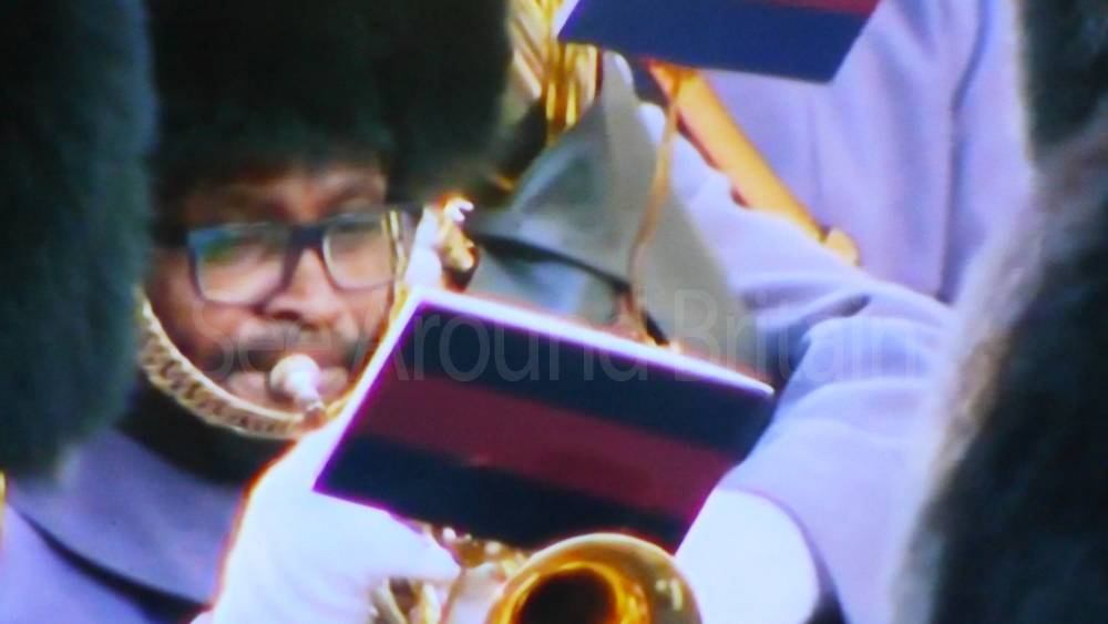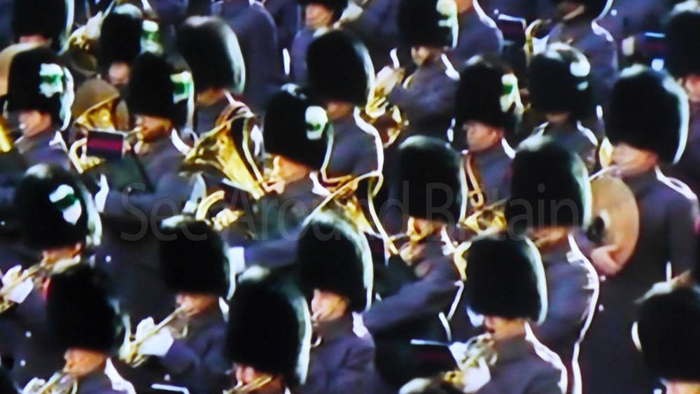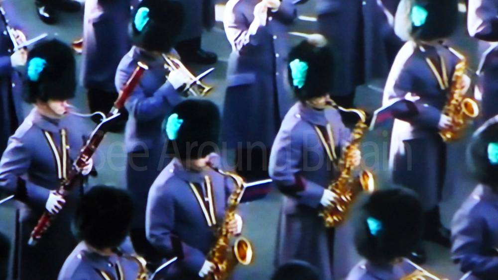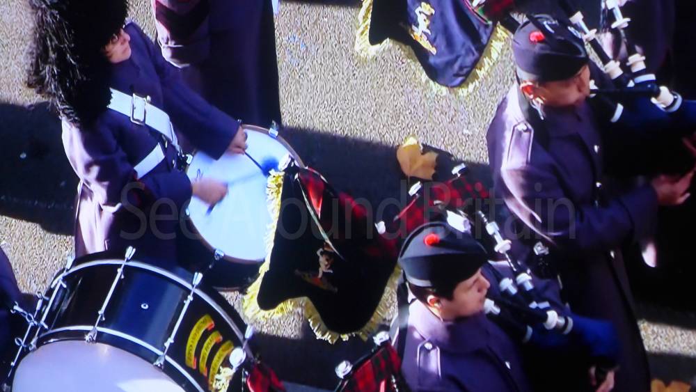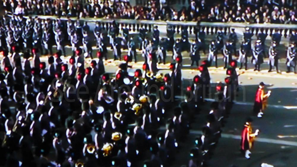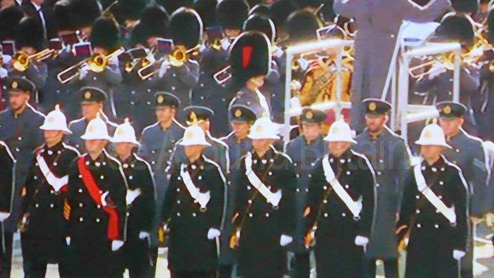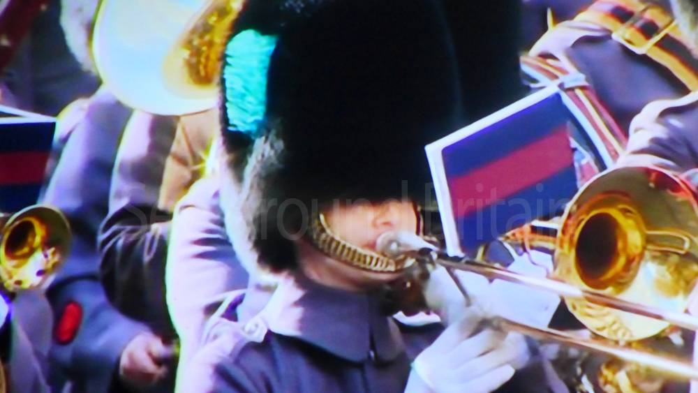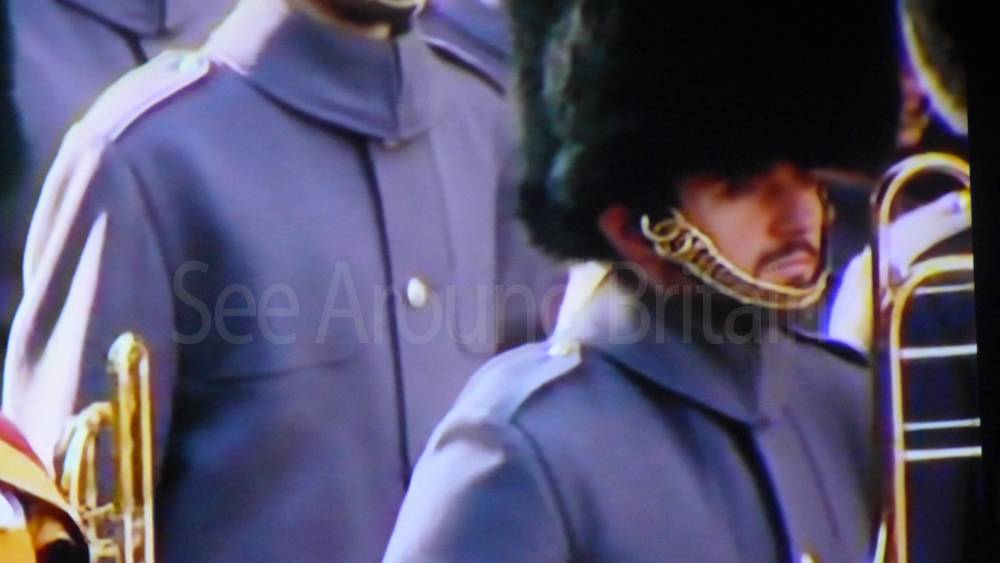 The ceremony begins at precisely 10:36 a.m. with a programme of music known as "the Traditional Music", a sequence beginning with "Rule Britannia!" which has remained largely unchanged since 1930.[12] This comprises a selection of National Airs and solemn music representing the four nations of the United Kingdom performed by the massed bands of the Household Division interposed Pipes and Drums from the Highlanders 4th Battalion The Royal Regiment of Scotland. The massed band represents the four nations; the Band of the Grenadier Guards, Band of the Coldstream Guards, Band of the Scots Guards and the Band of the Irish Guards.[13][14] "