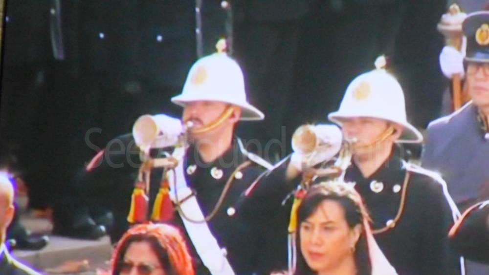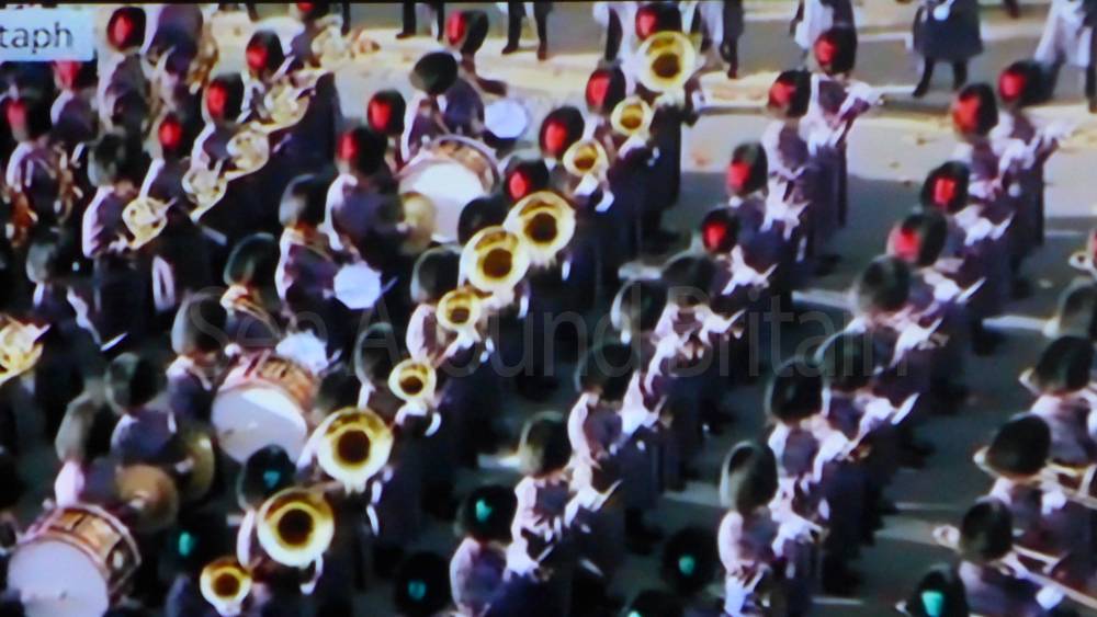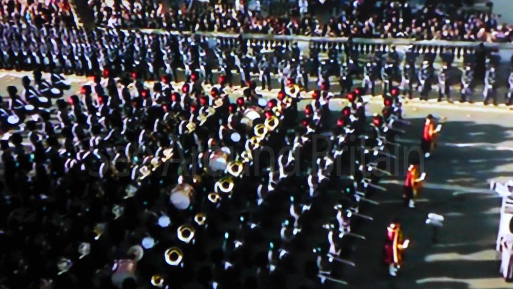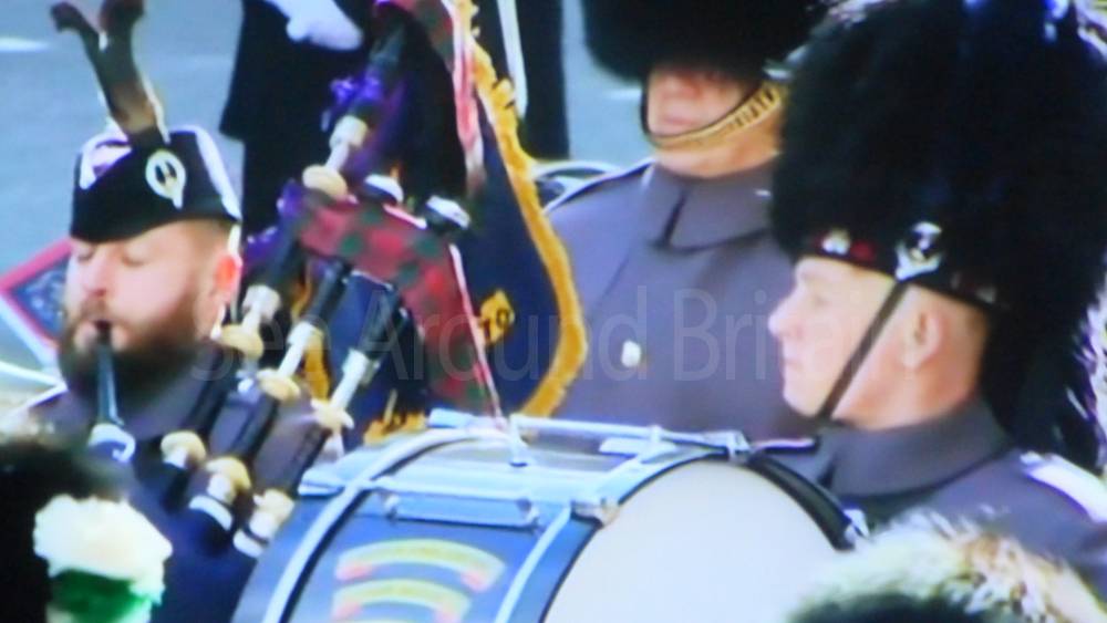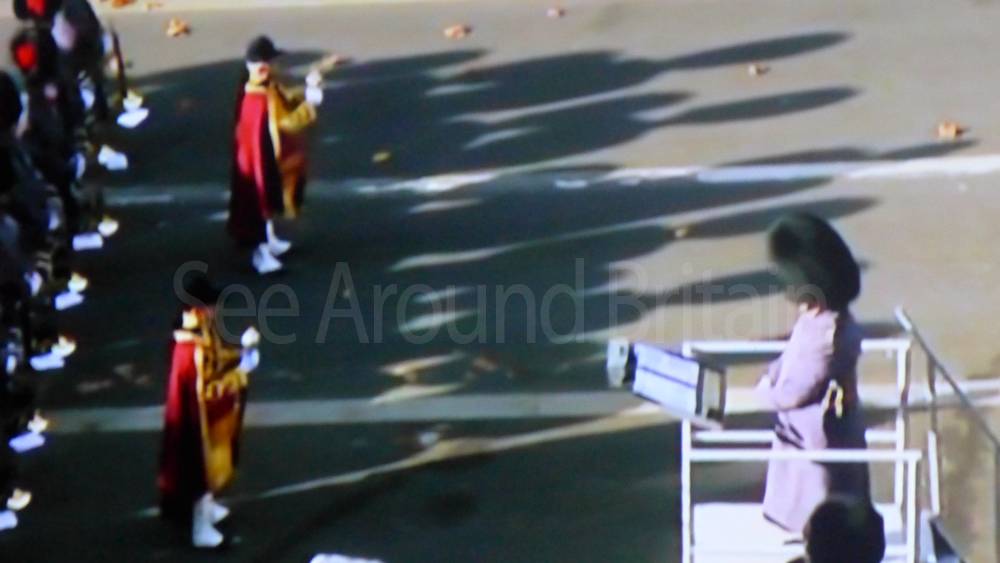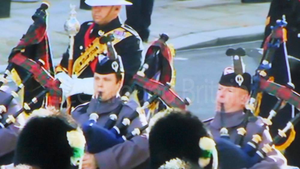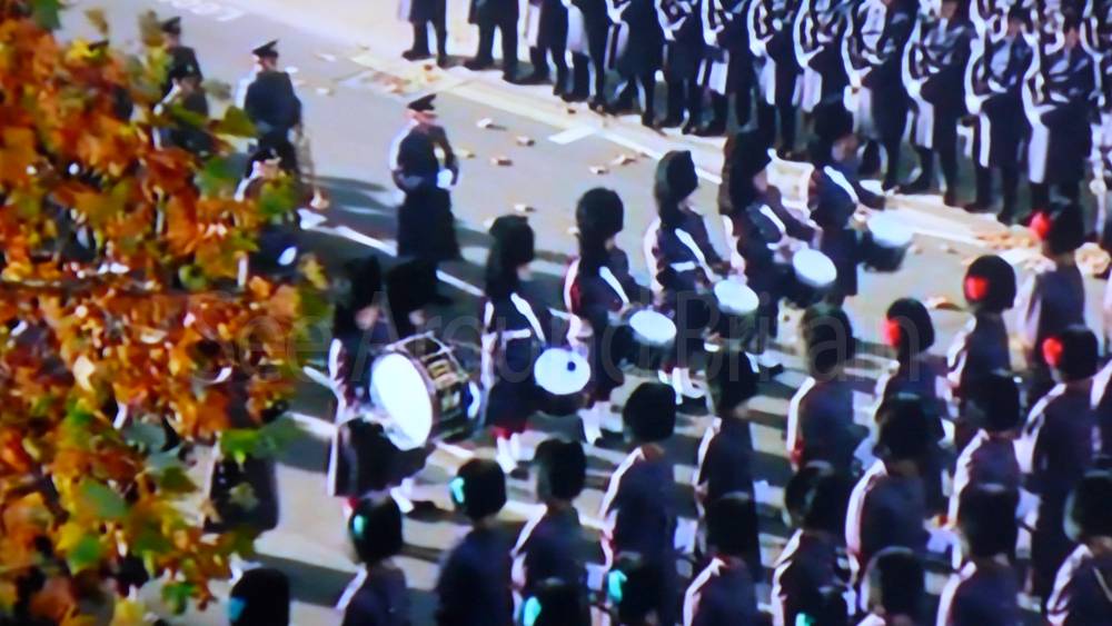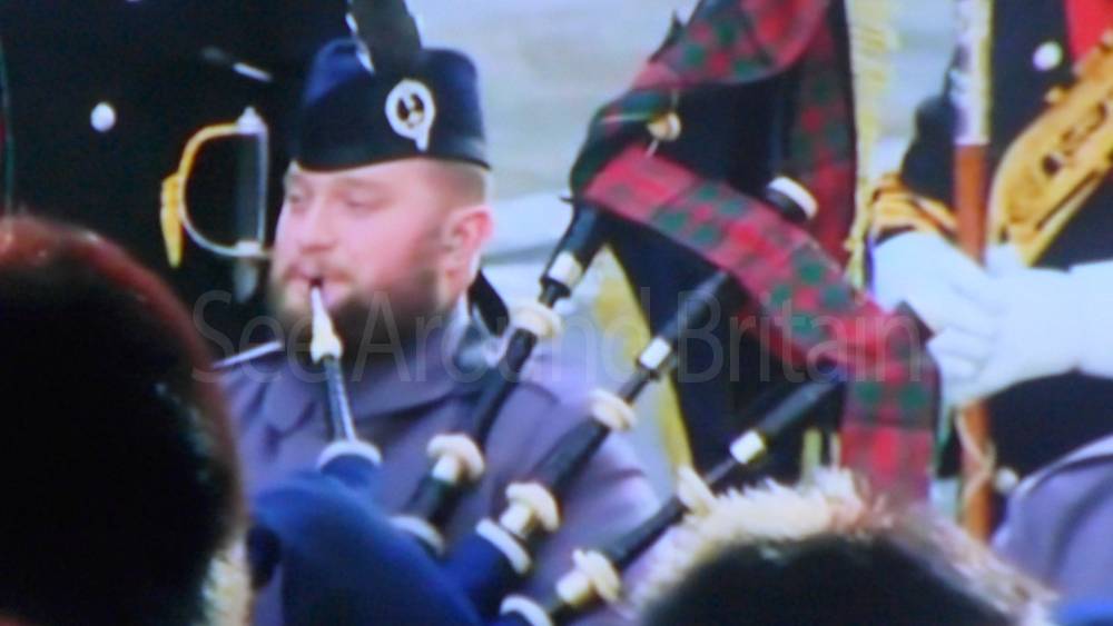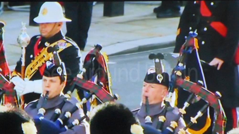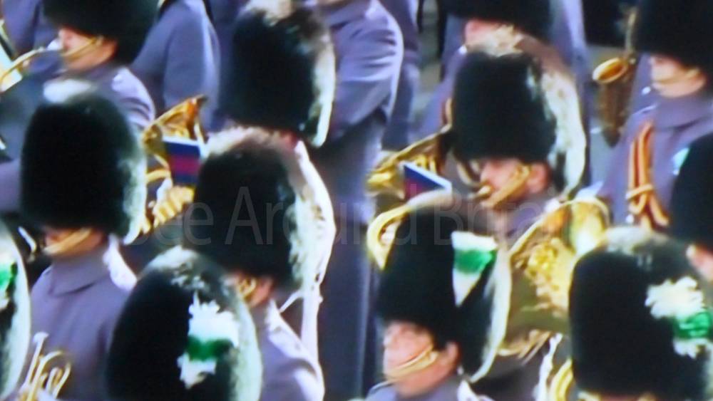 The ceremony begins at precisely 10:36 a.m. with a programme of music known as "the Traditional Music", a sequence beginning with "Rule Britannia!" which has remained largely unchanged since 1930.[12] This comprises a selection of National Airs and solemn music representing the four nations of the United Kingdom performed by the massed bands of the Household Division interposed Pipes and Drums from the Highlanders 4th Battalion The Royal Regiment of Scotland. The massed band represents the four nations; the Band of the Grenadier Guards, Band of the Coldstream Guards, Band of the Scots Guards and the Band of the Irish Guards.[13][14] "