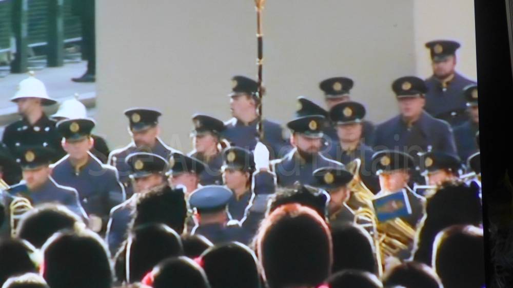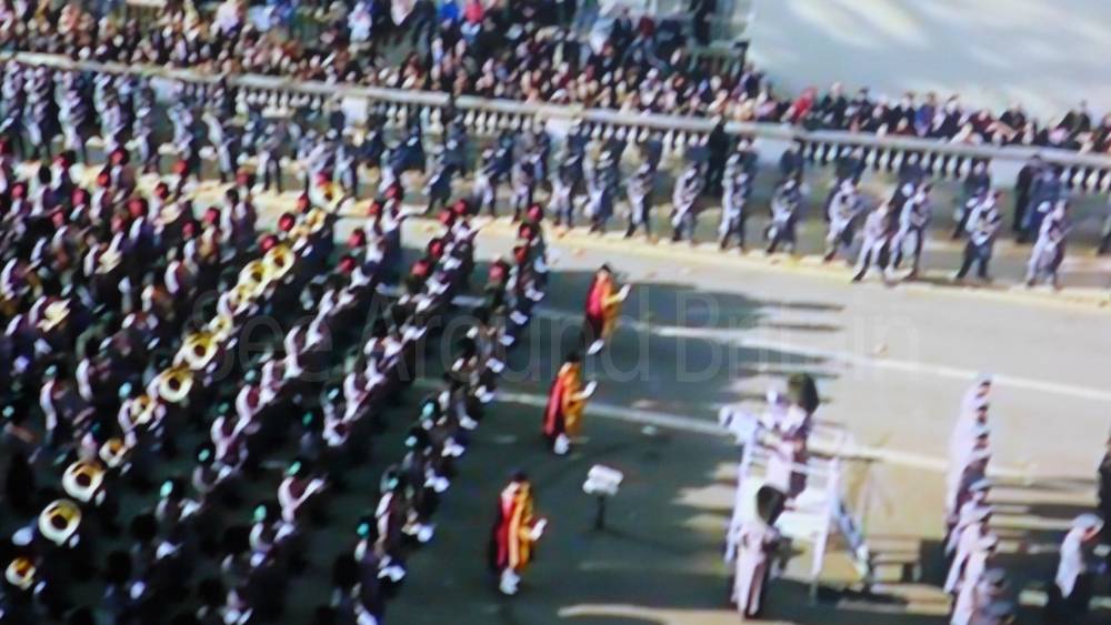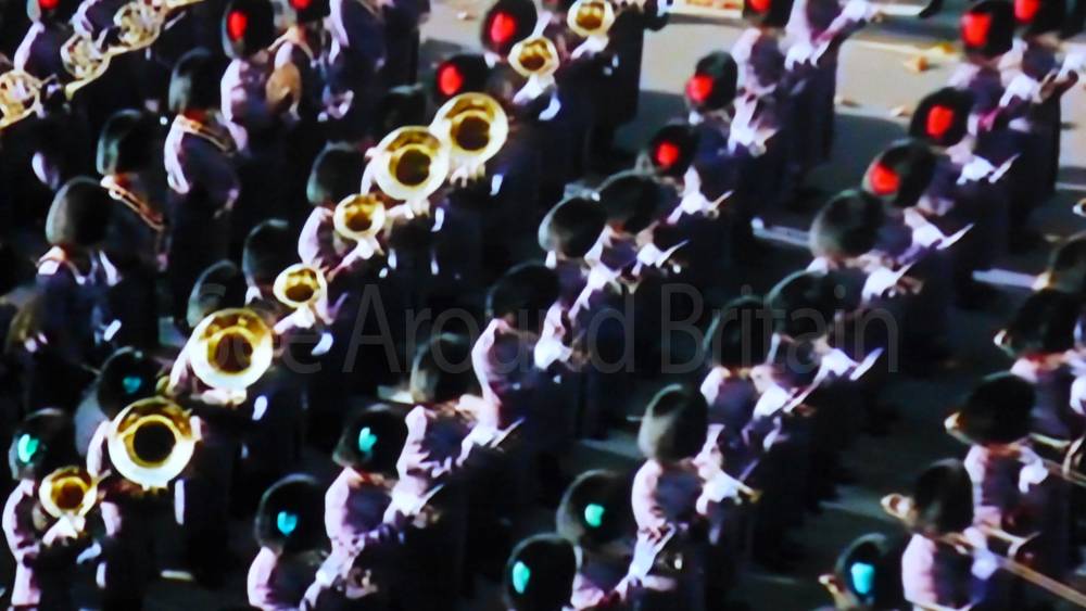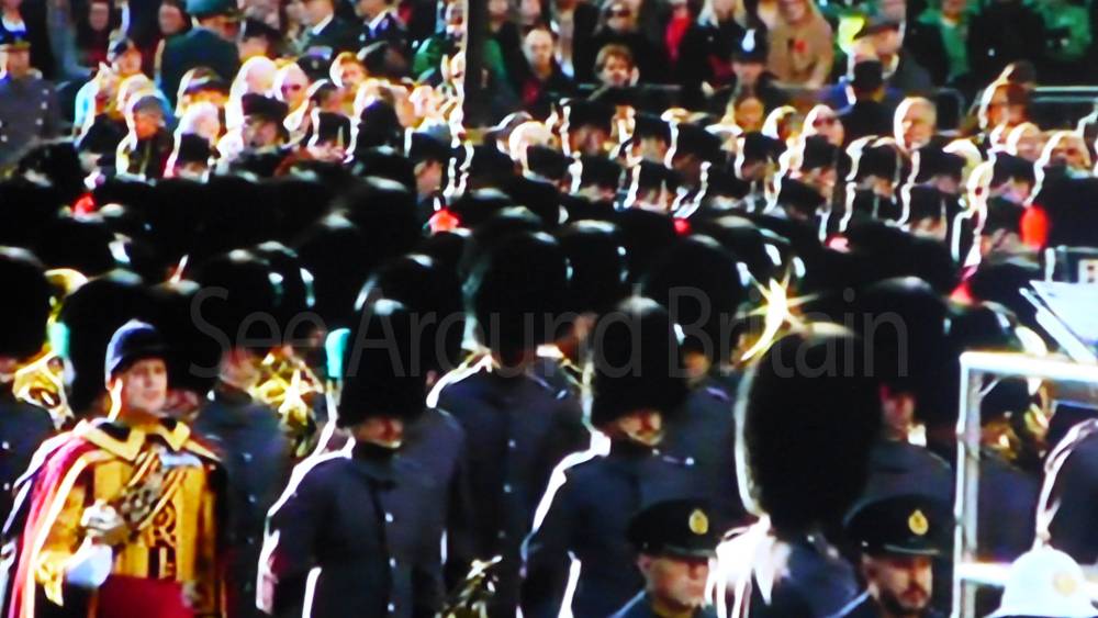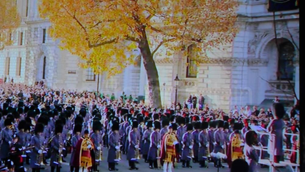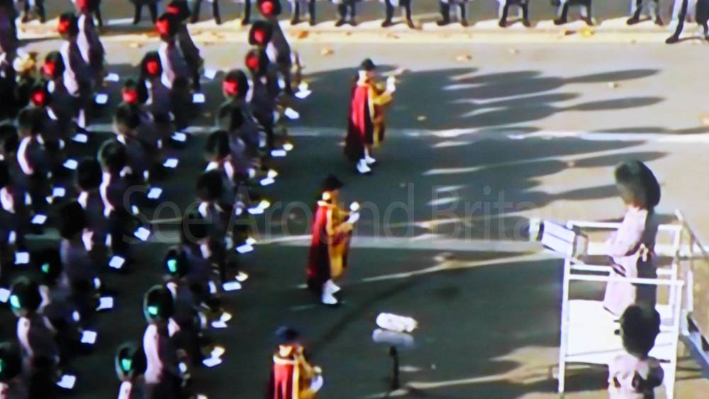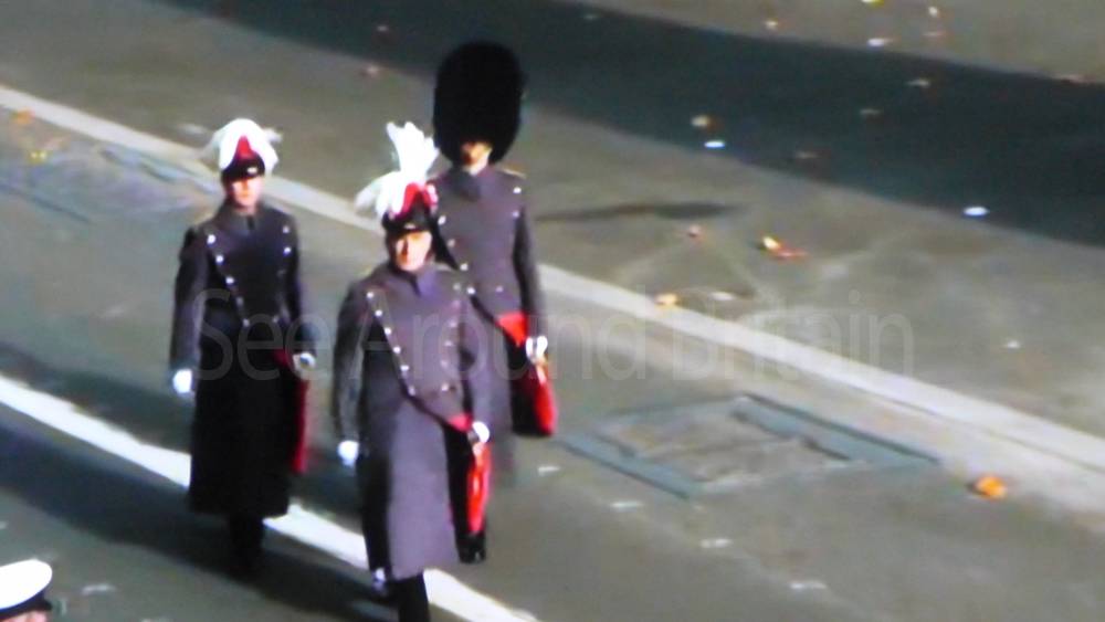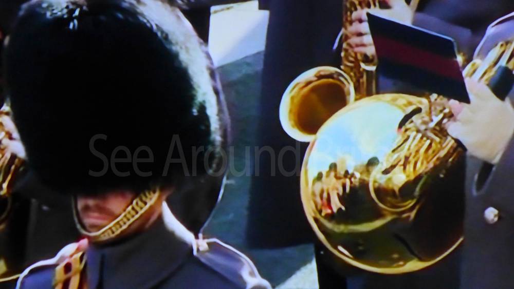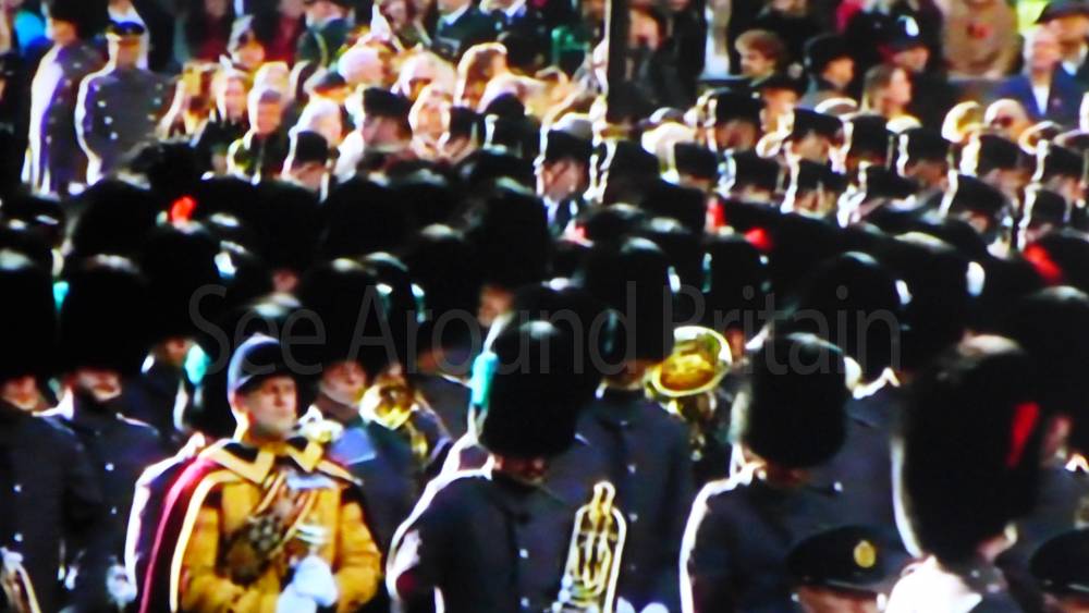 The ceremony begins at precisely 10:36 a.m. with a programme of music known as "the Traditional Music", a sequence beginning with "Rule Britannia!" which has remained largely unchanged since 1930.[12] This comprises a selection of National Airs and solemn music representing the four nations of the United Kingdom performed by the massed bands of the Household Division interposed Pipes and Drums from the Highlanders 4th Battalion The Royal Regiment of Scotland. The massed band represents the four nations; the Band of the Grenadier Guards, Band of the Coldstream Guards, Band of the Scots Guards and the Band of the Irish Guards.[13][14] "