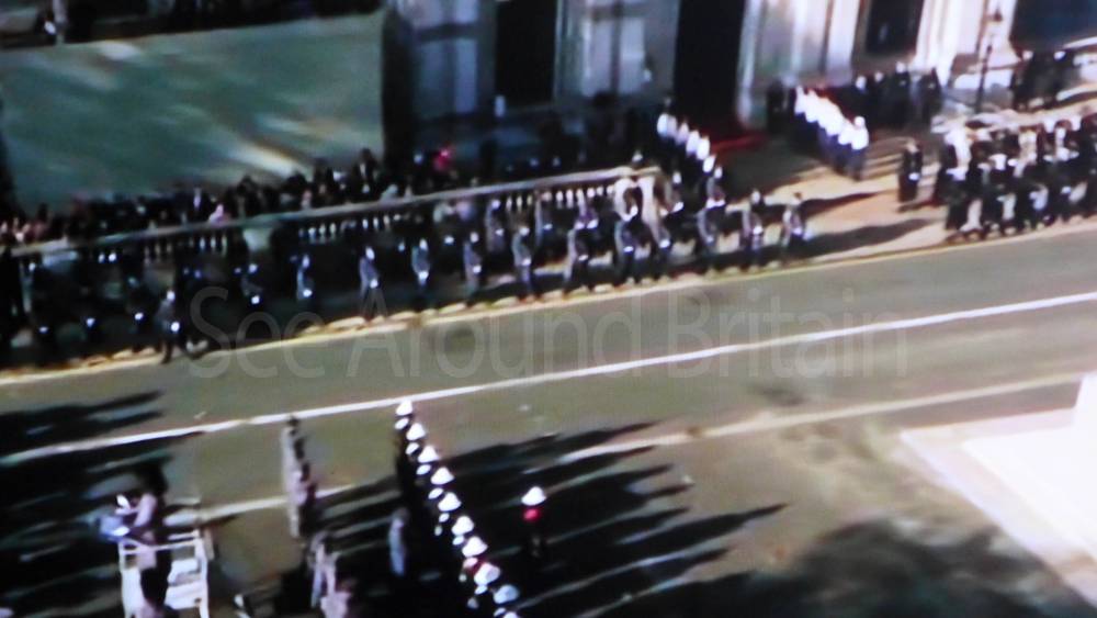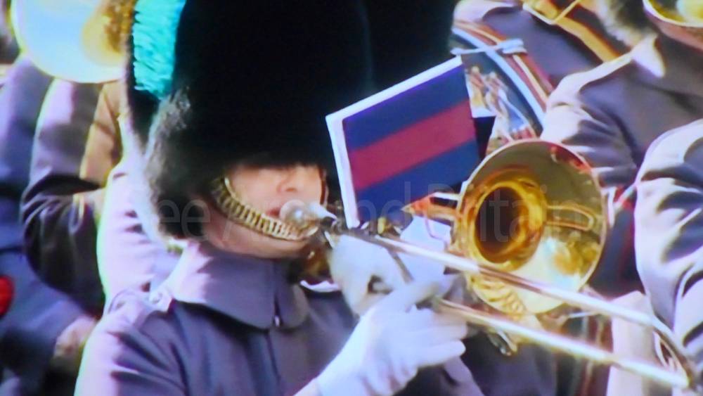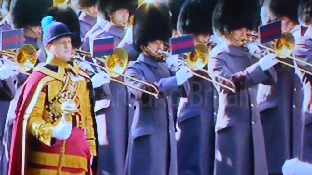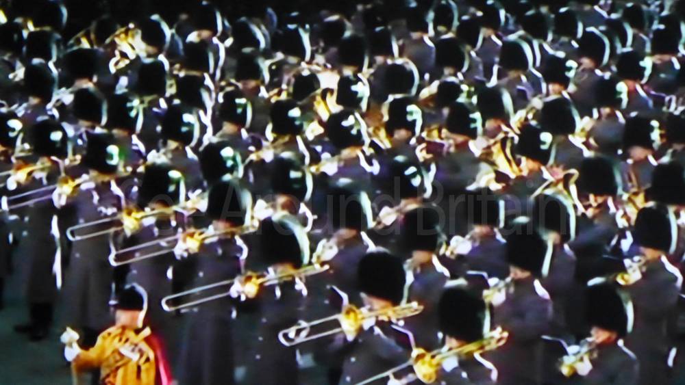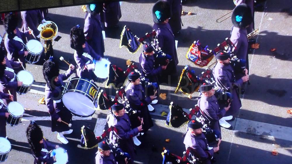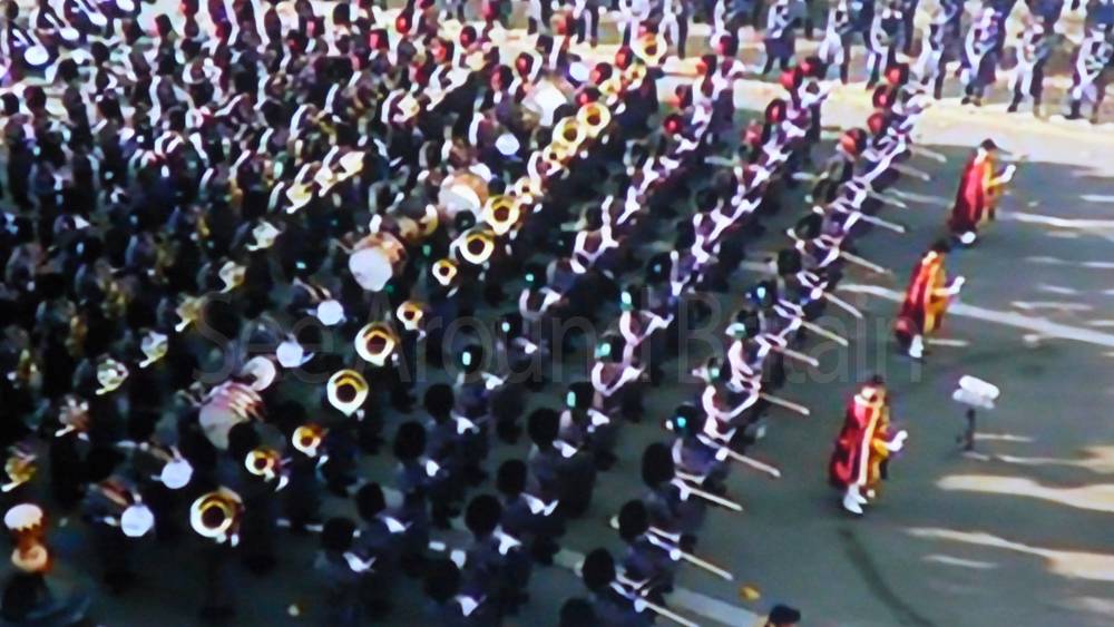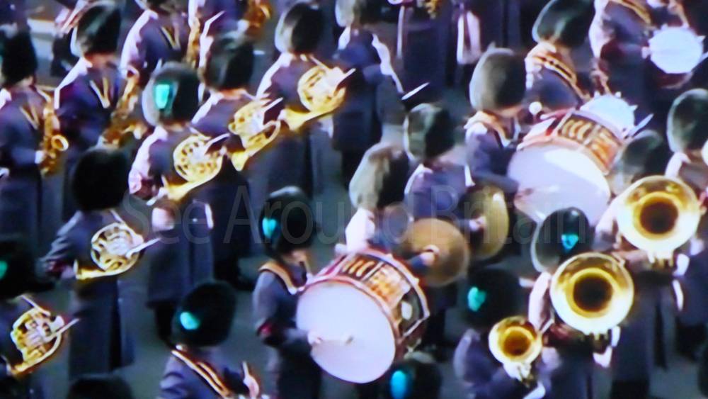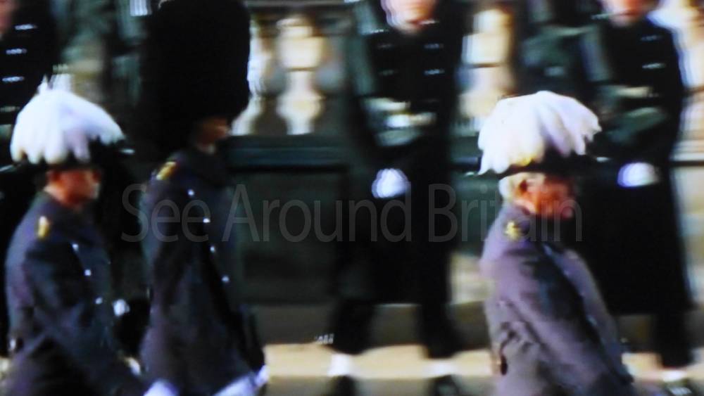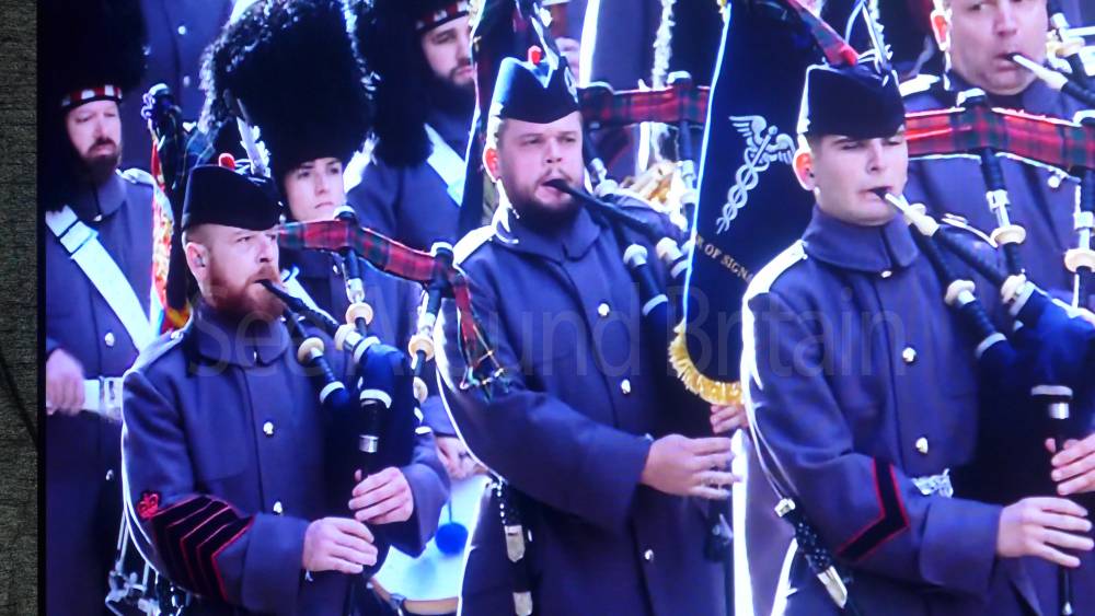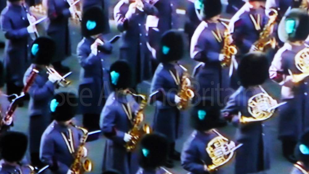 The ceremony begins at precisely 10:36 a.m. with a programme of music known as "the Traditional Music", a sequence beginning with "Rule Britannia!" which has remained largely unchanged since 1930.[12] This comprises a selection of National Airs and solemn music representing the four nations of the United Kingdom performed by the massed bands of the Household Division interposed Pipes and Drums from the Highlanders 4th Battalion The Royal Regiment of Scotland. The massed band represents the four nations; the Band of the Grenadier Guards, Band of the Coldstream Guards, Band of the Scots Guards and the Band of the Irish Guards.[13][14] "
