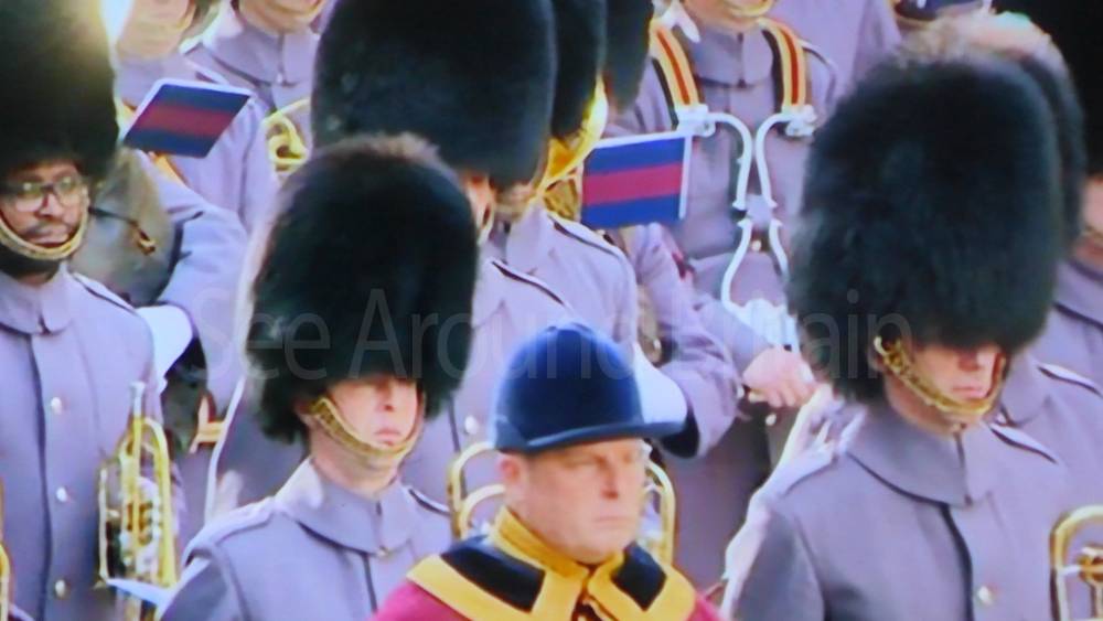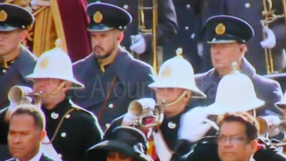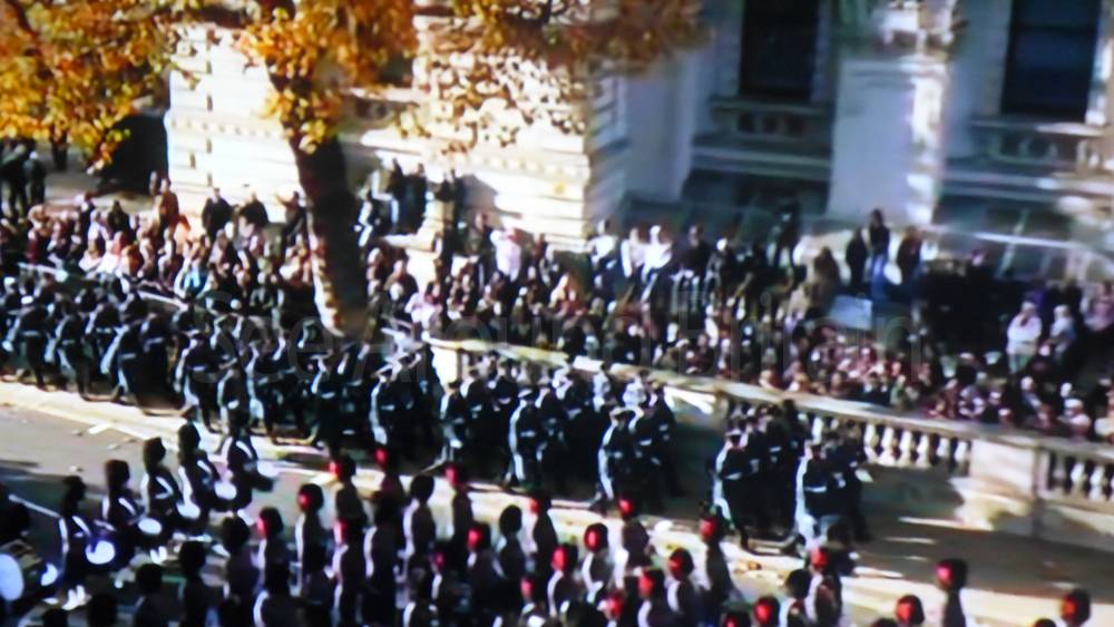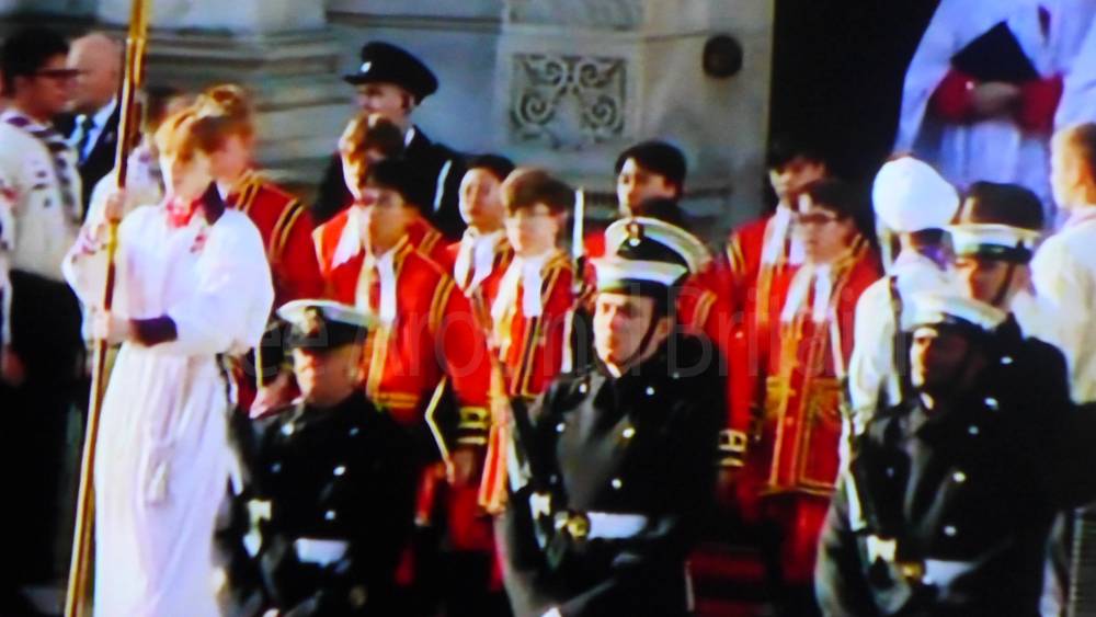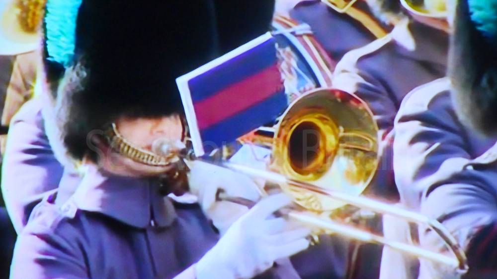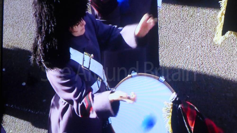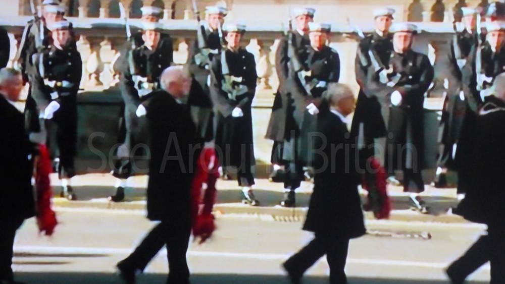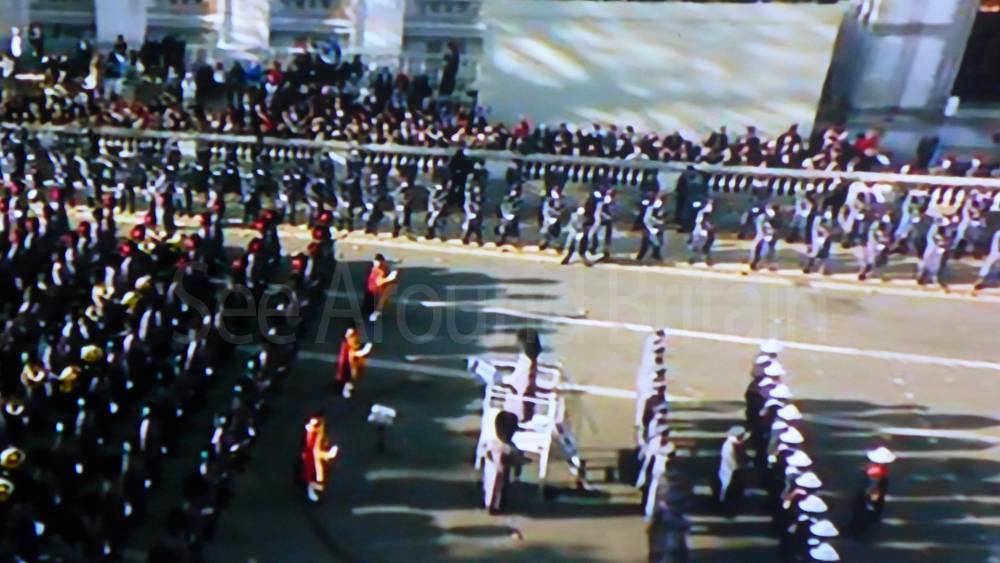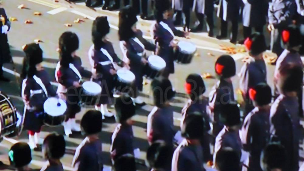 The ceremony begins at precisely 10:36 a.m. with a programme of music known as "the Traditional Music", a sequence beginning with "Rule Britannia!" which has remained largely unchanged since 1930.[12] This comprises a selection of National Airs and solemn music representing the four nations of the United Kingdom performed by the massed bands of the Household Division interposed Pipes and Drums from the Highlanders 4th Battalion The Royal Regiment of Scotland. The massed band represents the four nations; the Band of the Grenadier Guards, Band of the Coldstream Guards, Band of the Scots Guards and the Band of the Irish Guards.[13][14] "