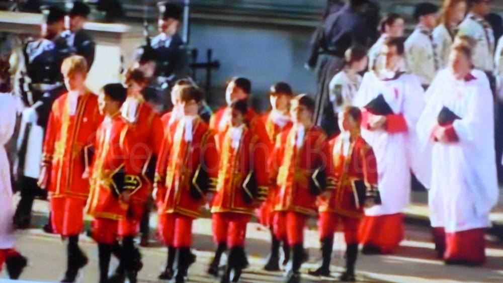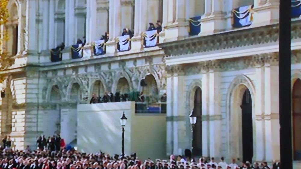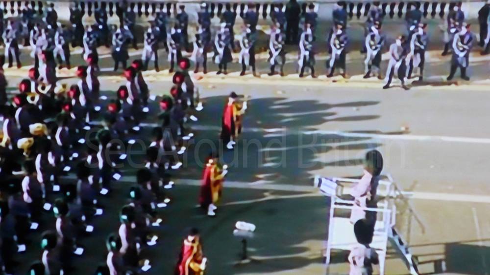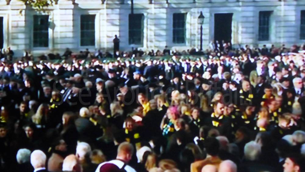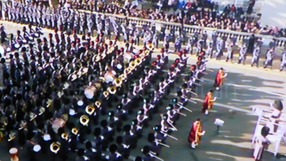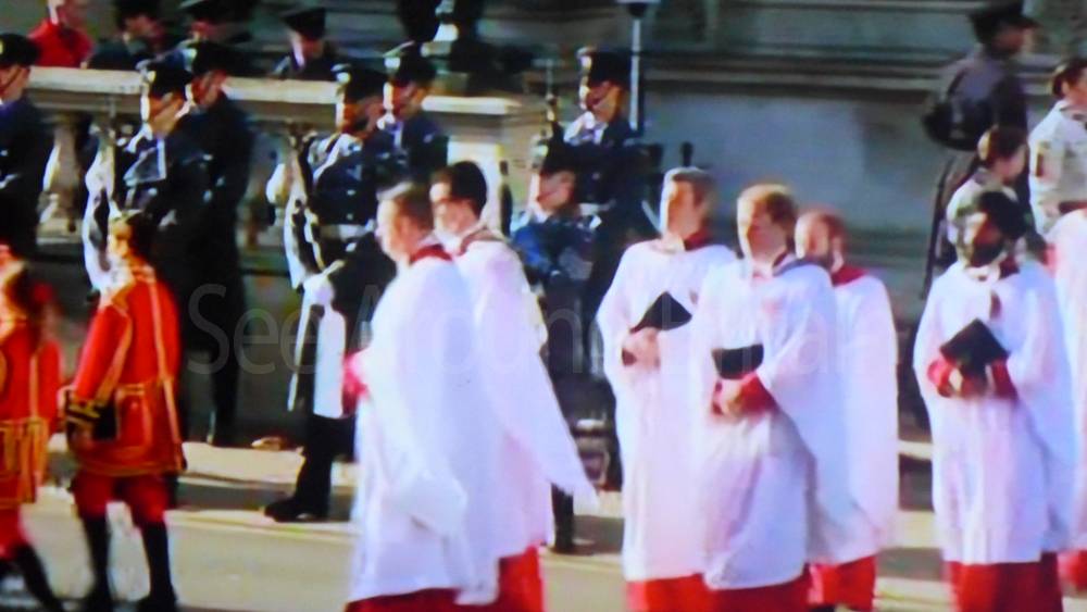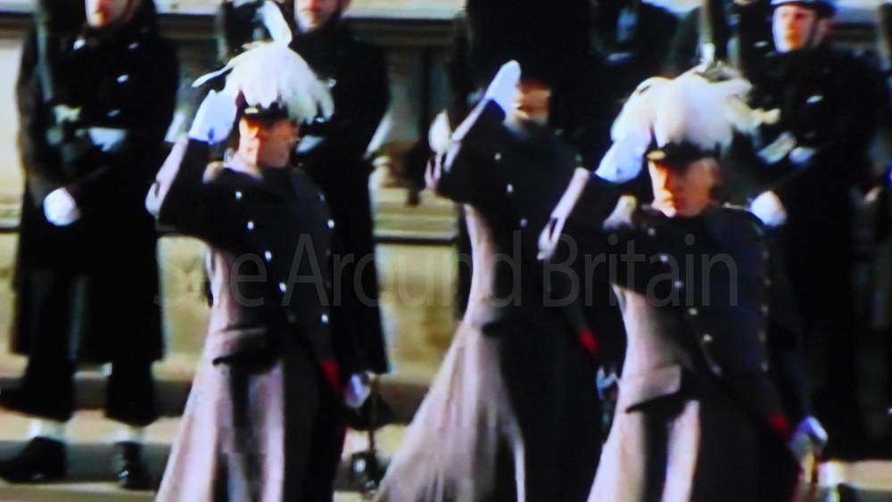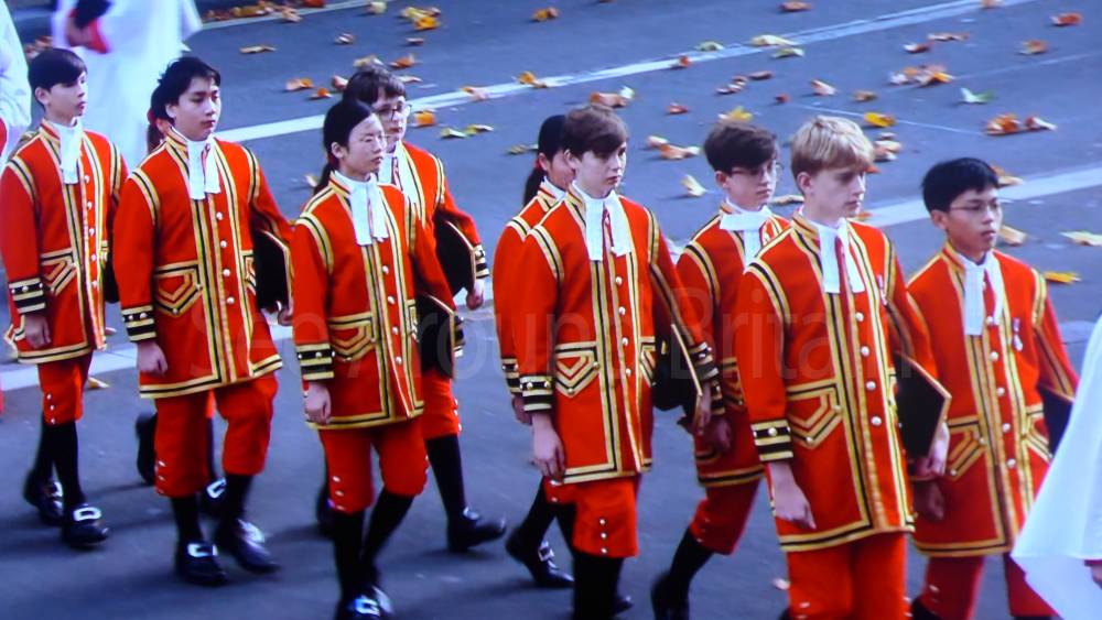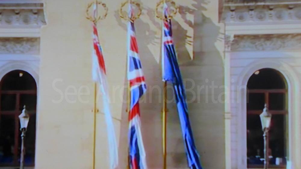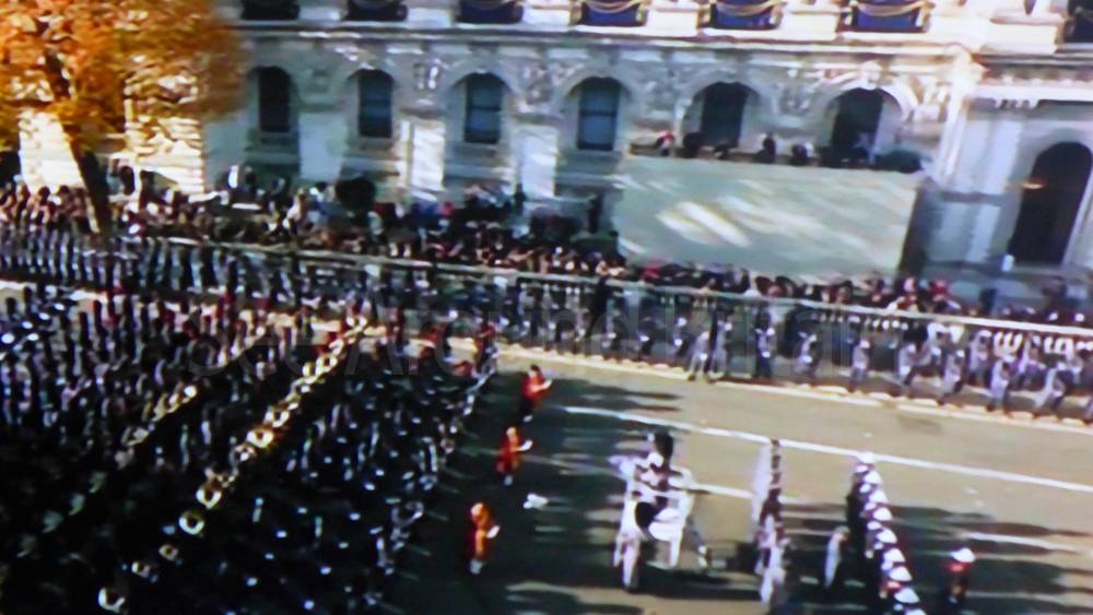 The ceremony begins at precisely 10:36 a.m. with a programme of music known as "the Traditional Music", a sequence beginning with "Rule Britannia!" which has remained largely unchanged since 1930.[12] This comprises a selection of National Airs and solemn music representing the four nations of the United Kingdom performed by the massed bands of the Household Division interposed Pipes and Drums from the Highlanders 4th Battalion The Royal Regiment of Scotland. The massed band represents the four nations; the Band of the Grenadier Guards, Band of the Coldstream Guards, Band of the Scots Guards and the Band of the Irish Guards.[13][14] "