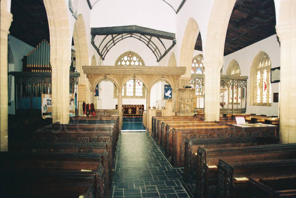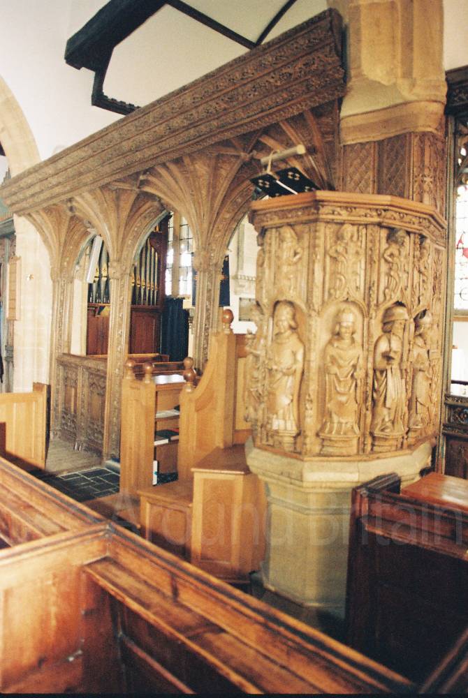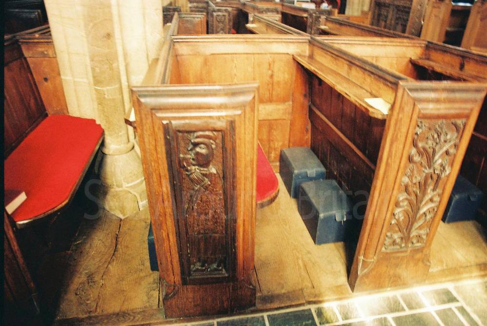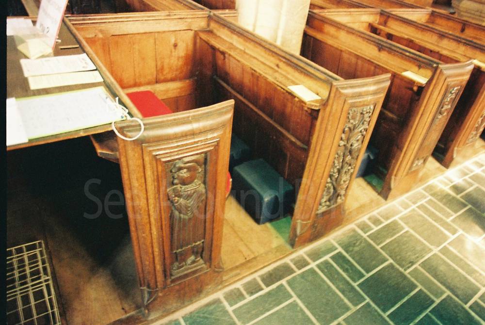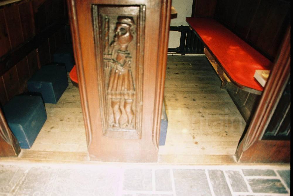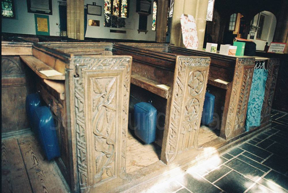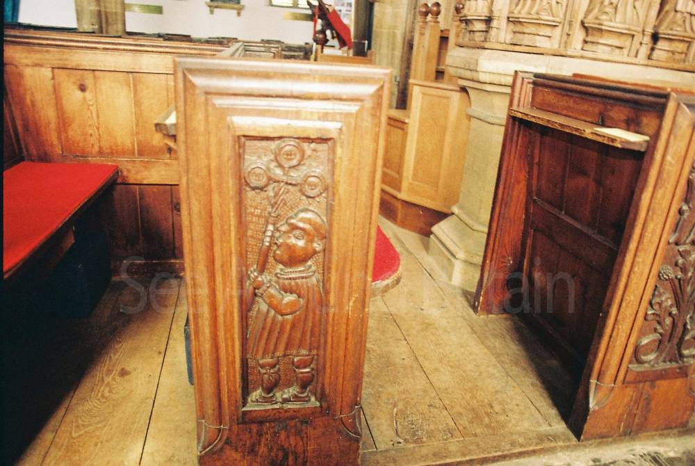 The east window, dating from the 15th century, depicts the crucifixion with St John and the Mother of Jesus at the foot of the Cross.[3] The pulpit is believed to date from the 16th century, moving to its current position from the north arcade as part of a Victorian restoration around 1863.[4] The extensive mid-16th century bench ends include a unique pre-Reformation procession.[5]