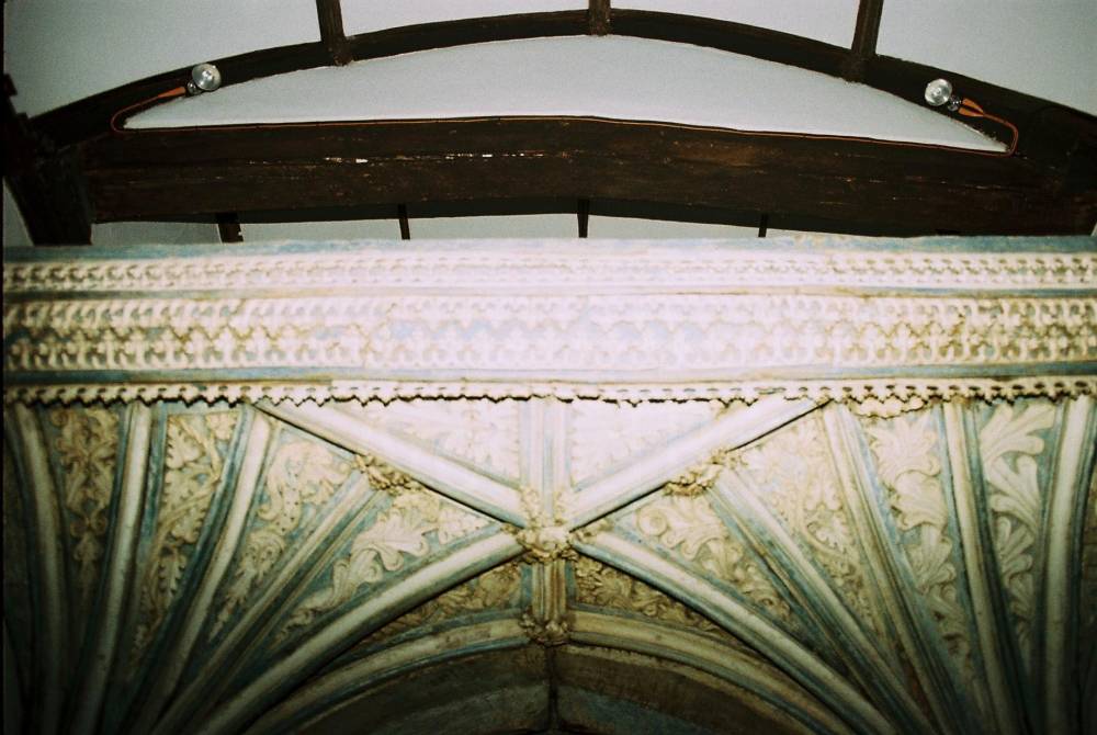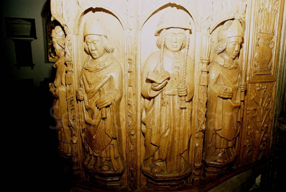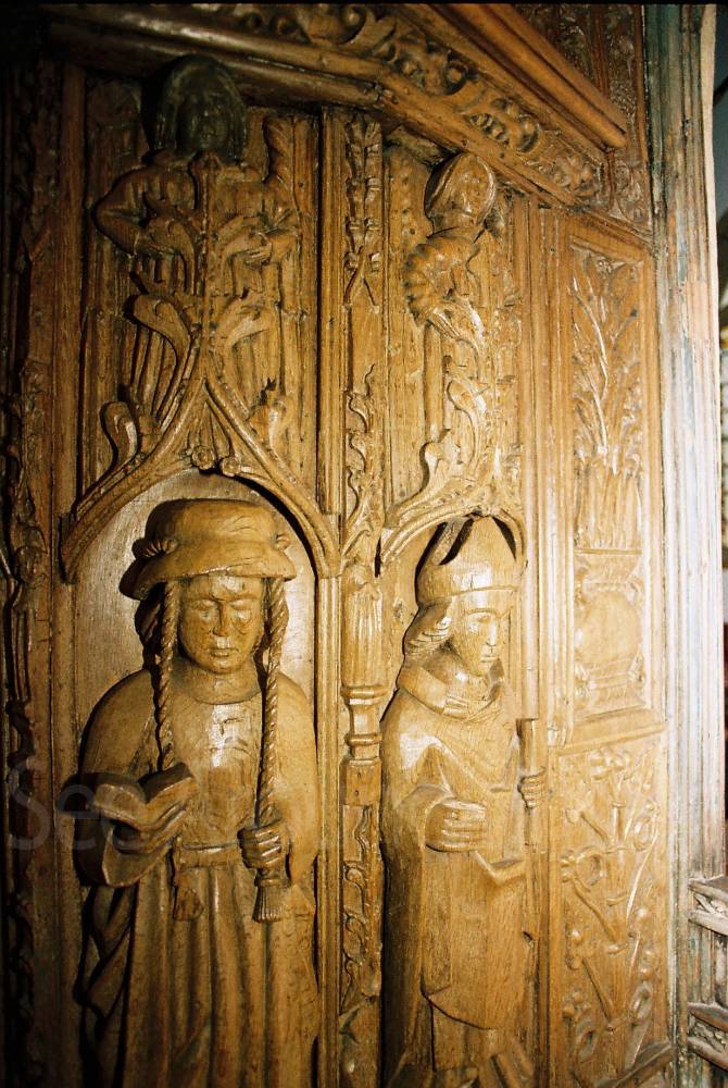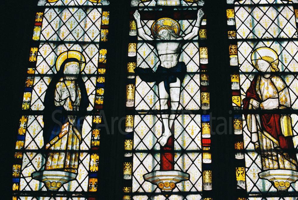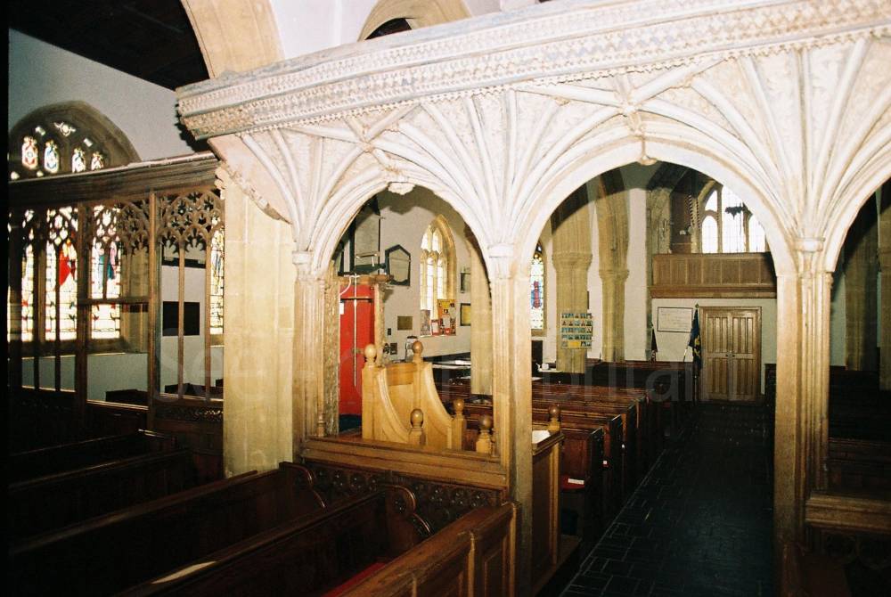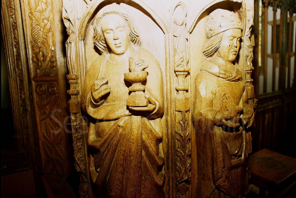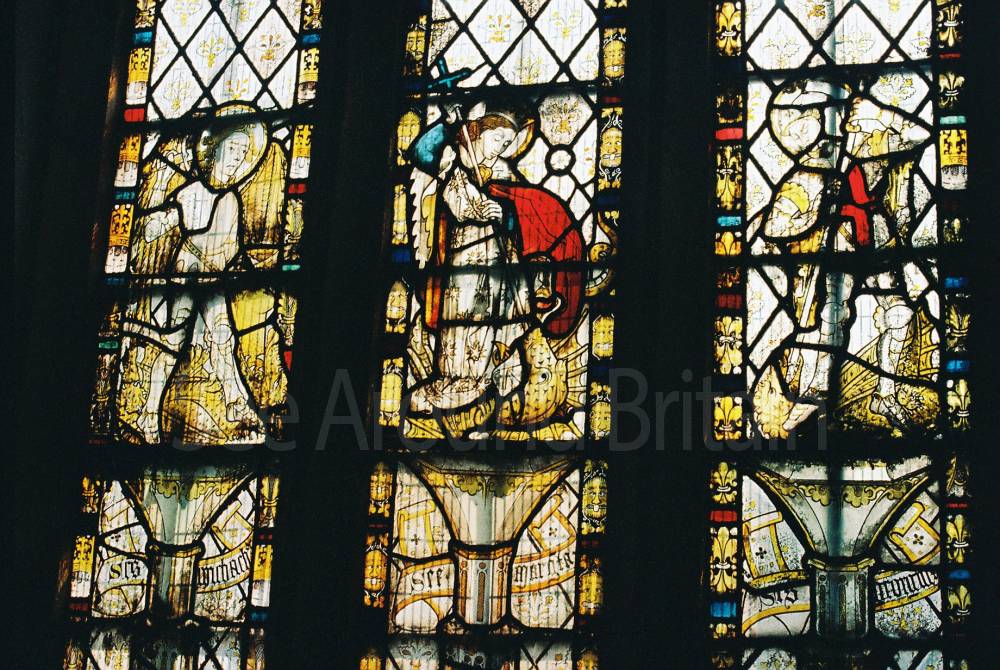 The east window, dating from the 15th century, depicts the crucifixion with St John and the Mother of Jesus at the foot of the Cross.[3] The pulpit is believed to date from the 16th century, moving to its current position from the north arcade as part of a Victorian restoration around 1863.[4] The extensive mid-16th century bench ends include a unique pre-Reformation procession.[5]
