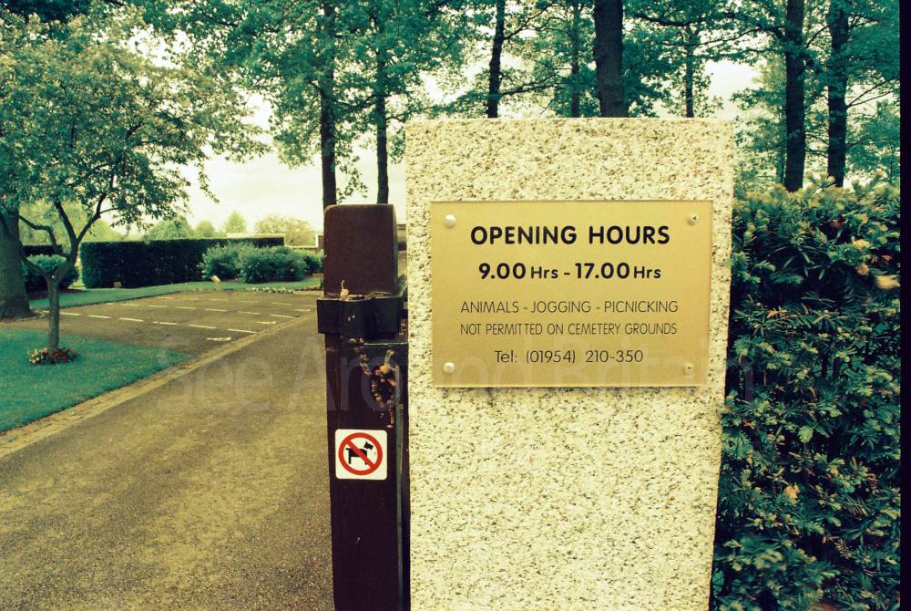 From A14 Southbound: Take the A1307 exit as the road forms the M11 and turn right at the roundabout at the end of the slip road. Just after the next roundabout turn left signposted for Madingley. Drive through the village and keep right at the roundabout at the end of the village, signposted for the Cemetery. At the roundabout, at the top of the hill, turn left onto the A1303 signposted for the Cemetery. The entrance appears on the left hand side a little way down the road.