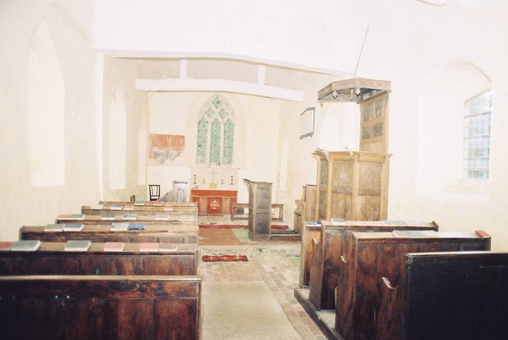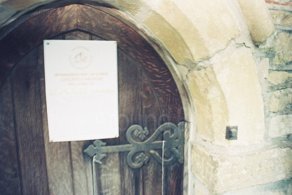 "The Church of England parish church of Saint Peter was built in the 14th century. It consists of a continuous nave and chancel with no chancel arch between them. The chancel masonry is ashlar, noticeably better-dressed and more evenly coursed than that of the nave. The church building includes a 12th-century Norman doorway re-used from an earlier church on the same site.[1] The font is tub-shaped, suggesting that it too is Norman. The chancel windows are Perpendicular Gothic. The east window has ogee tracery and includes 14th century stained glass.[1] The piscina also is ogeed. Beside the east window on the east wall are the remains of a medieval wall painting. The woodwork of the pulpit and reading desk are Jacobean items carved in the 17th century. The pulpit bears the date 1633 but Sherwood and Pevsner suggest that it was assembled in the 19th century from Jacobean materials.[1] St. Peter's is a Grade II* listed building.[2] "
