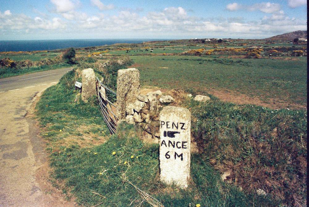 Guide post marking six miles to Penzance, Treen, Cornwall