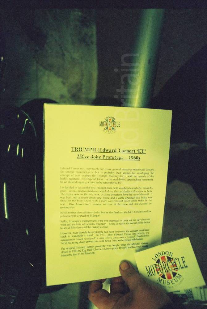 "London Motorcycle Museum displayed a range of over 150 classic and British motorcycles. It permanently closed in October 2019, partly due to inability to meet the running costs. A charitable trust, it opened in May 1999 at Oldfield Lane South, Greenford, Ealing. It displayed a range of over 150 classic and British motorcycles. Notable exhibits included the last Triumph Bonneville T140 out of the Meriden gates in 1983.
