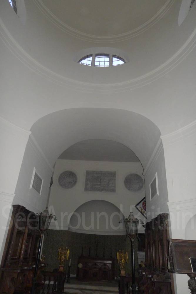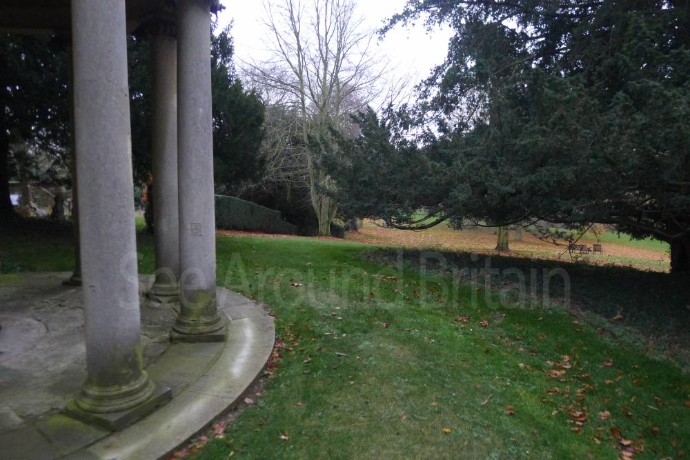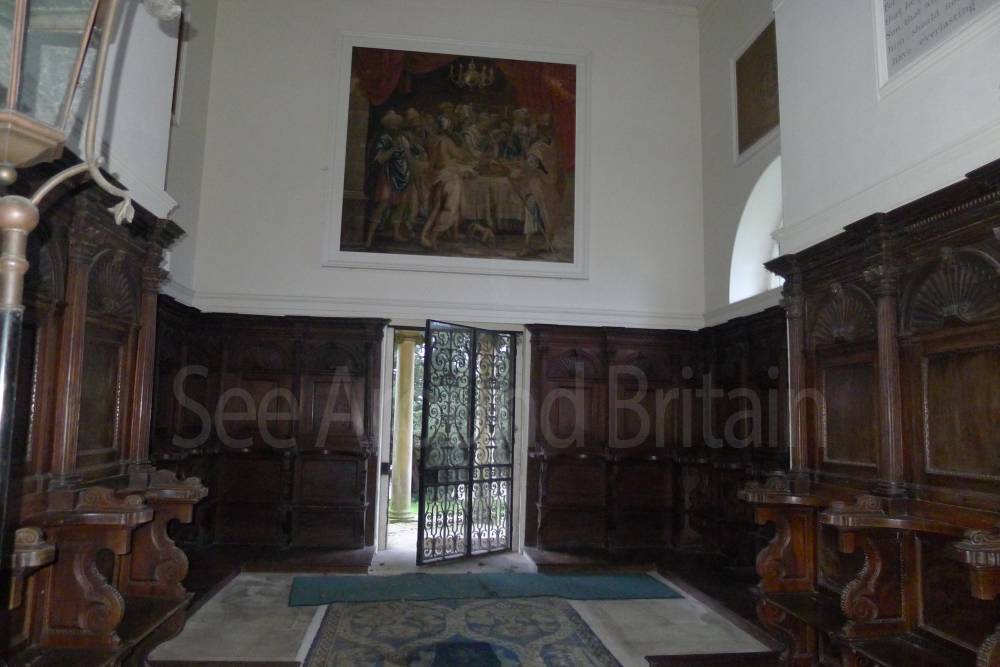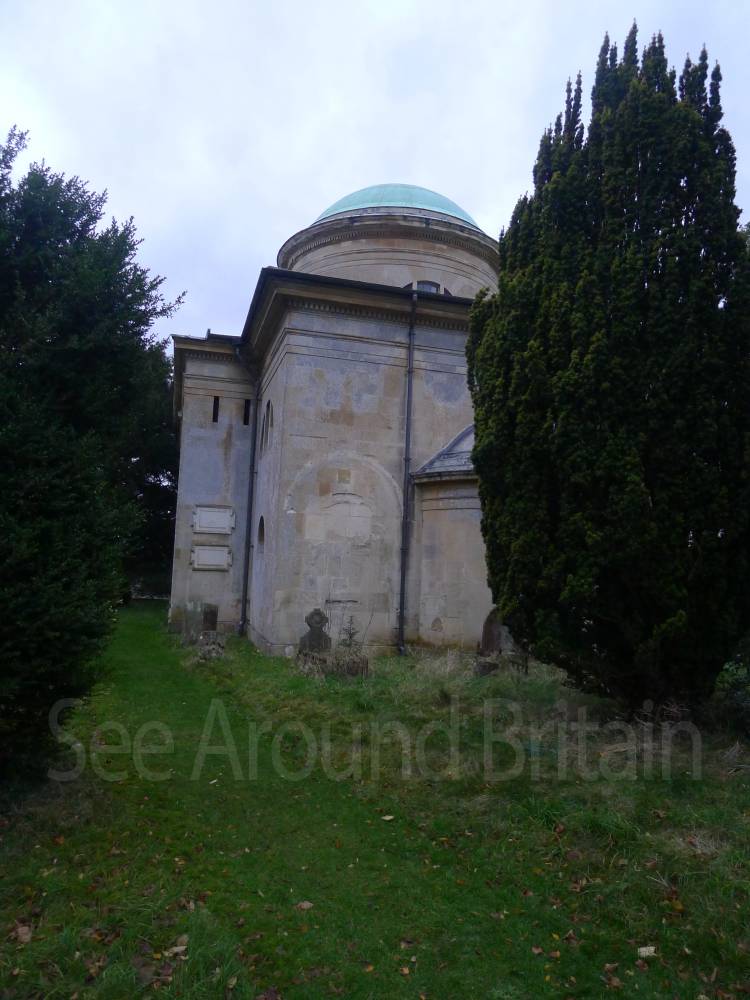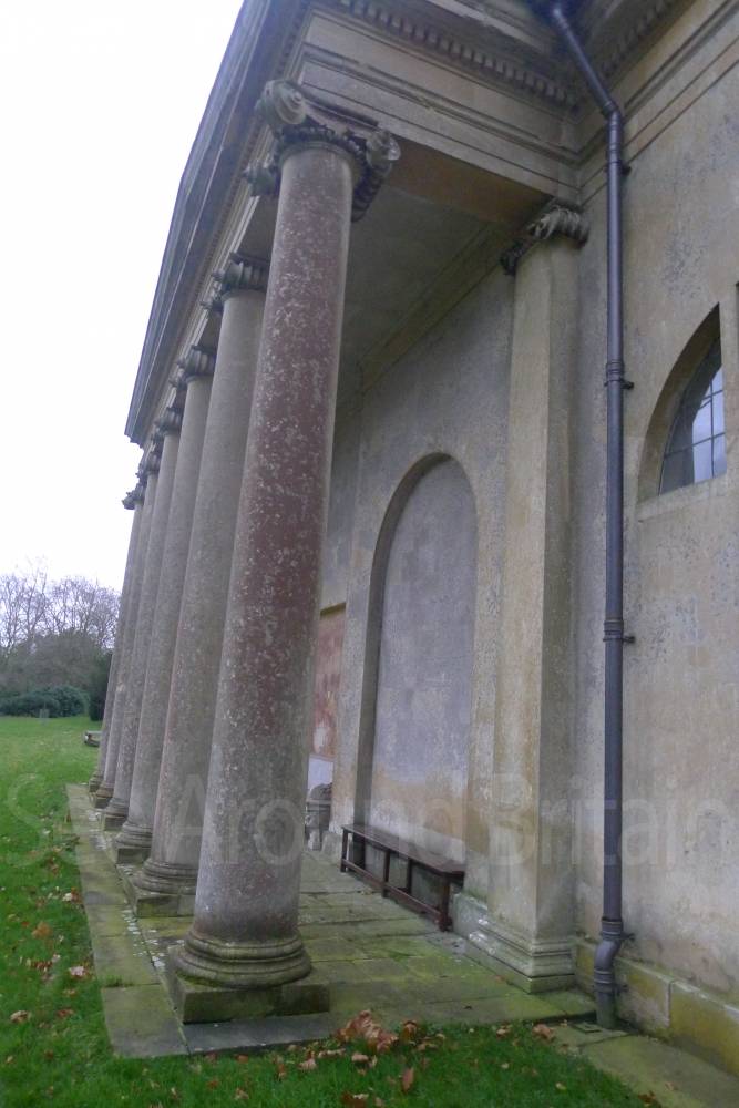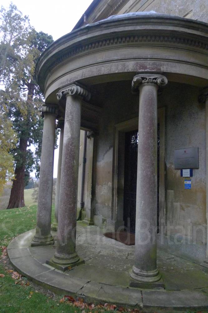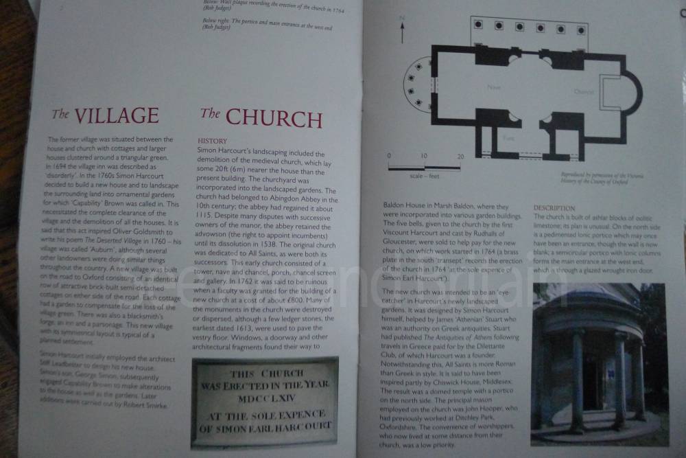 Earl Harcourt had the next All Saints parish church, the Old All Saints Church, built in 1764 about 20 feet (6 m) away from the medieval one's site. The Earl was an amateur architect and designed the church himself in the Neoclassical Greek Revival style, aided by the Neoclassicist James "Athenian" Stuart. It is a domed Palladian style temple. It is conventionally oriented, with its entrance on the west facade and altar in the east end, but also has a doorless Ionic portico on its north side overlooking the River Thames. The church is positioned on a slight rise on the river bluff to maximise its effect in the landscape park design. [2] The removal of the village to a new site put the 1764 church almost 1-mile (1.6 km) away by winding, partly wooded footpaths. Its austere Neoclassical Palladian design also became unpopular during the 19th-century Gothic Revival. A new church was completed in 1874, which left the 1764 church to become the Harcourt family chapel. In 1880 ornately-carved Italian fittings were added to its austere interior.[2] The Churches Conservation Trust now cares for the building.[19]