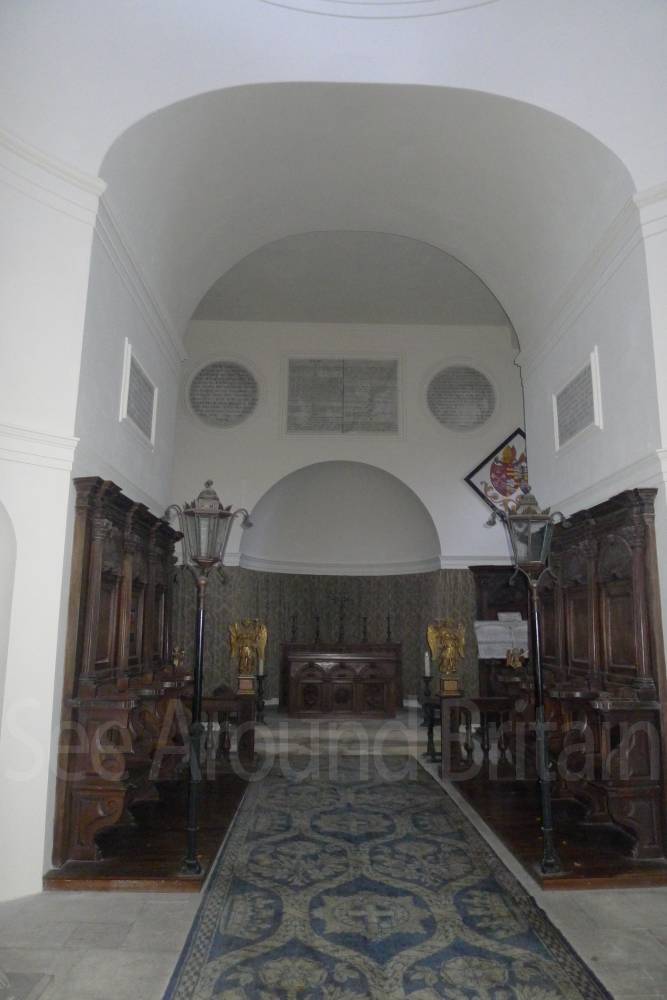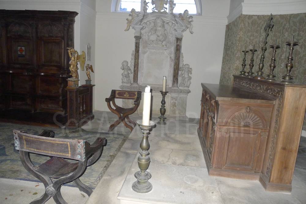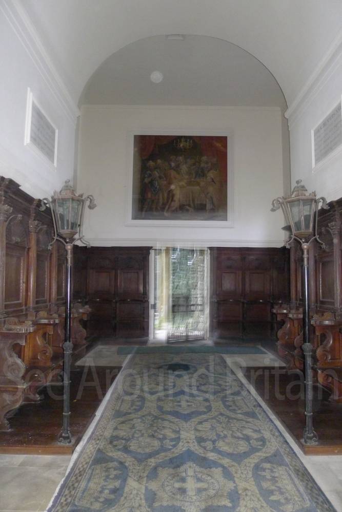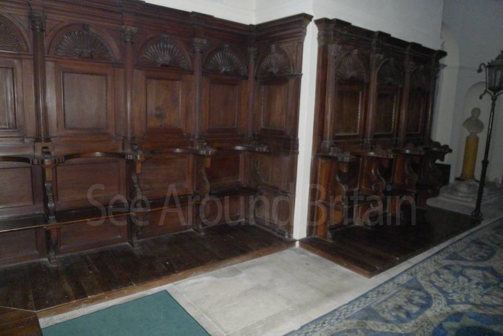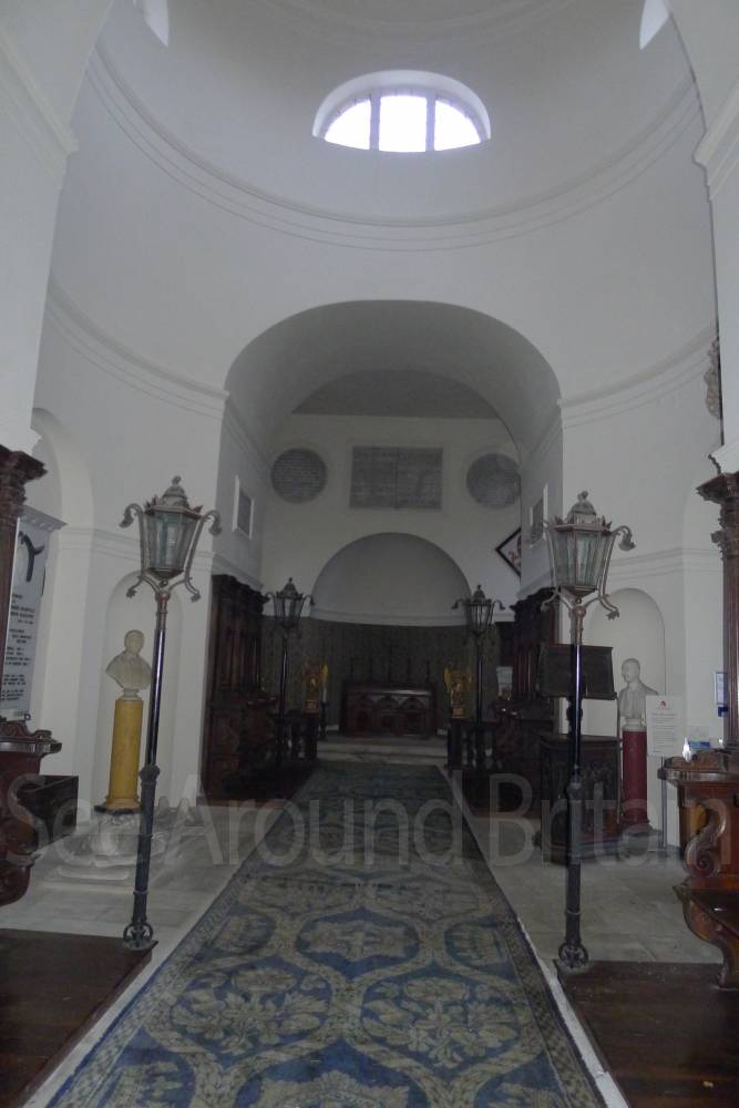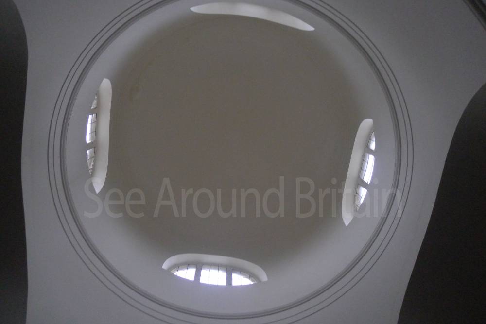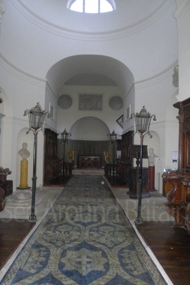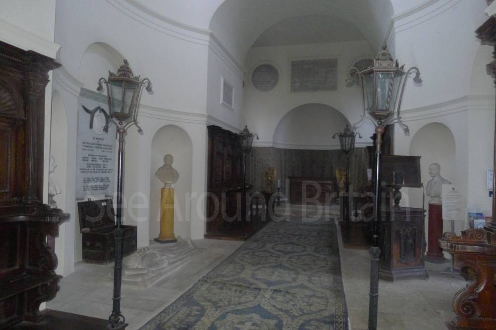 Earl Harcourt had the next All Saints parish church, the Old All Saints Church, built in 1764 about 20 feet (6 m) away from the medieval one's site. The Earl was an amateur architect and designed the church himself in the Neoclassical Greek Revival style, aided by the Neoclassicist James "Athenian" Stuart. It is a domed Palladian style temple. It is conventionally oriented, with its entrance on the west facade and altar in the east end, but also has a doorless Ionic portico on its north side overlooking the River Thames. The church is positioned on a slight rise on the river bluff to maximise its effect in the landscape park design. [2] The removal of the village to a new site put the 1764 church almost 1-mile (1.6 km) away by winding, partly wooded footpaths. Its austere Neoclassical Palladian design also became unpopular during the 19th-century Gothic Revival. A new church was completed in 1874, which left the 1764 church to become the Harcourt family chapel. In 1880 ornately-carved Italian fittings were added to its austere interior.[2] The Churches Conservation Trust now cares for the building.[19]