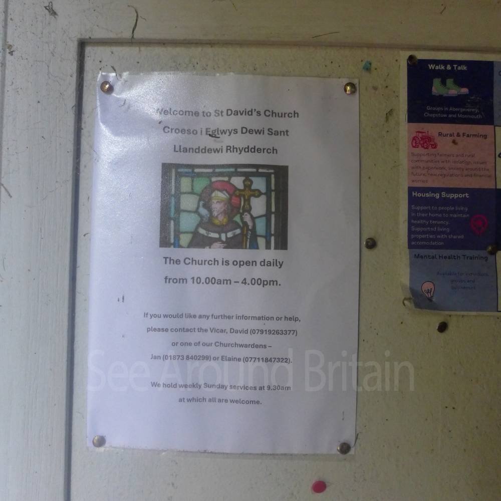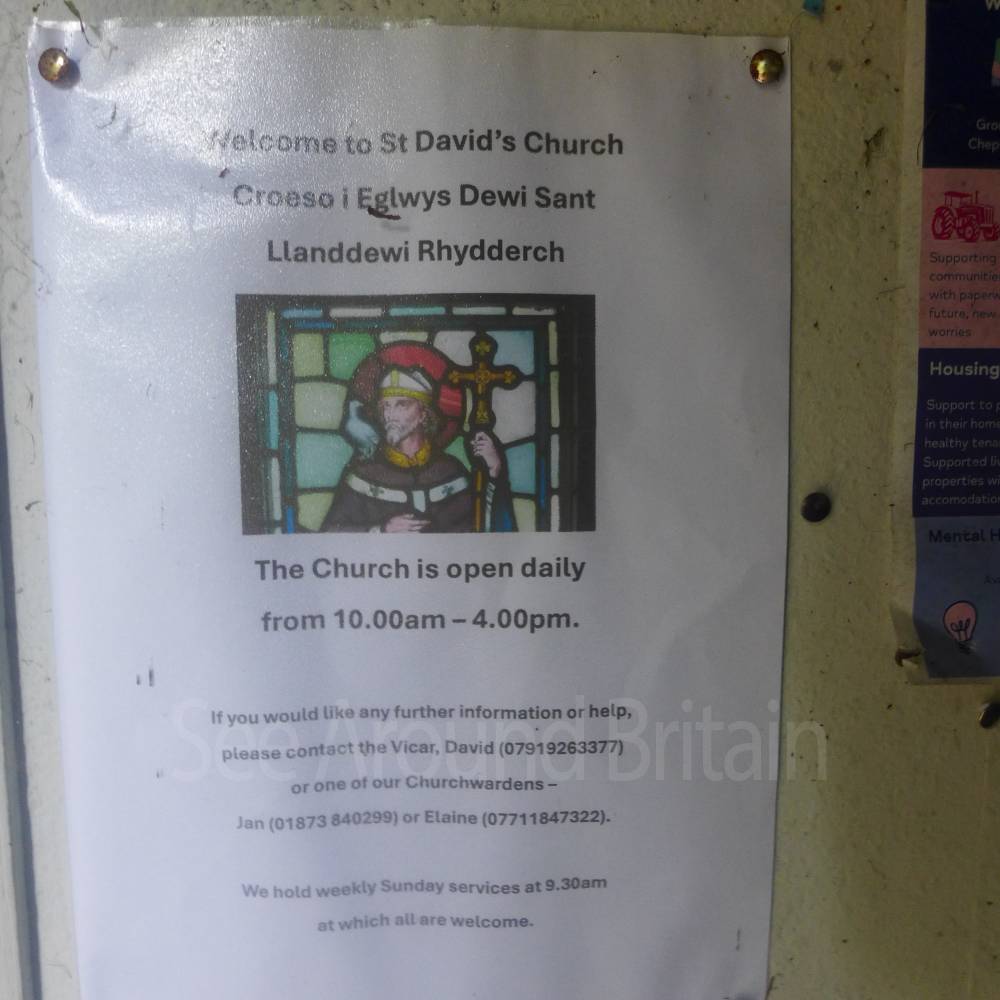 https://northmonmouthshireministryarea.org.uk/churches/llanddewi-rhydderch/st-davids-llanddewi-rhydderch/ 2025: St David’s is open daily for visitors between 10am-5pm