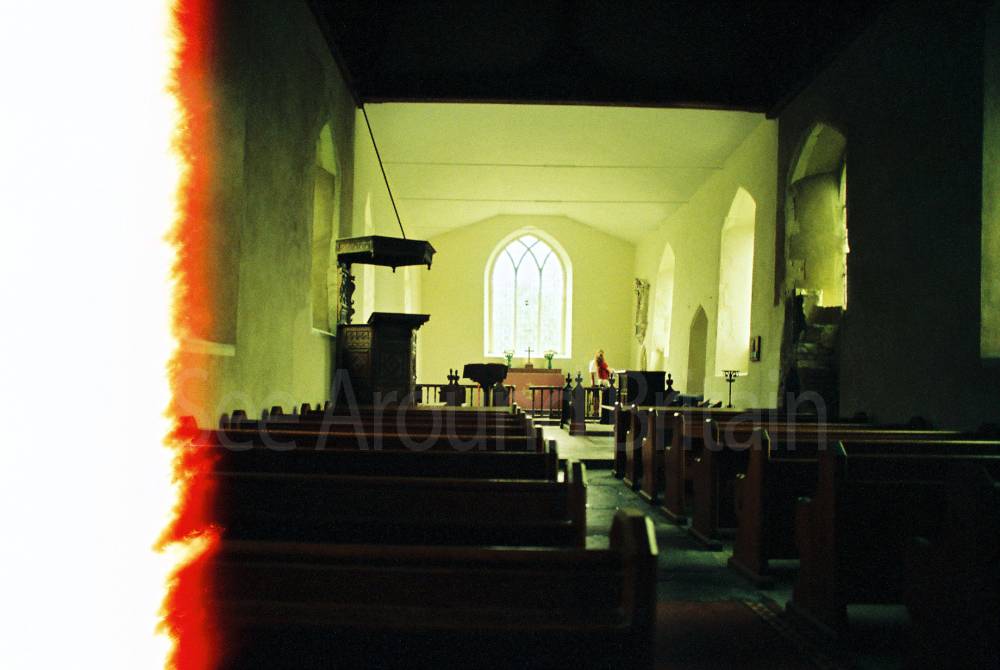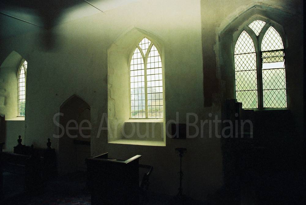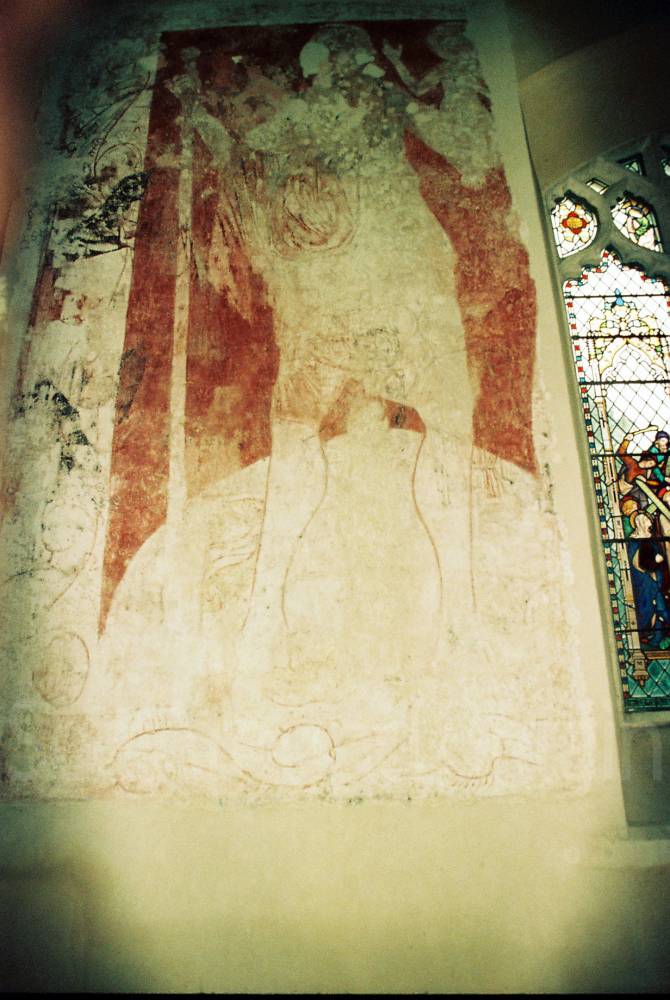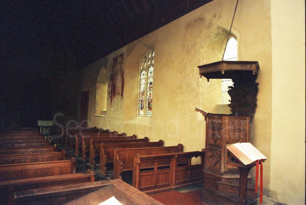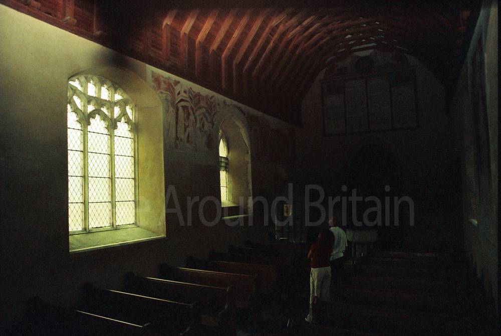 This is an isolated church set in meadows beside a farm, with an attractive Norman round tower that has a conical tiled roof. Inside, St Mary's boasts a series of beautiful fourteenth-century wall paintings, elegantly rendered in shades of grey and ochre depicting St Christopher and scenes from the Seven Works of Mercy, as well as the Ten Commandments. There is also a thirteenth-century font and a seventeenth-century pulpit."