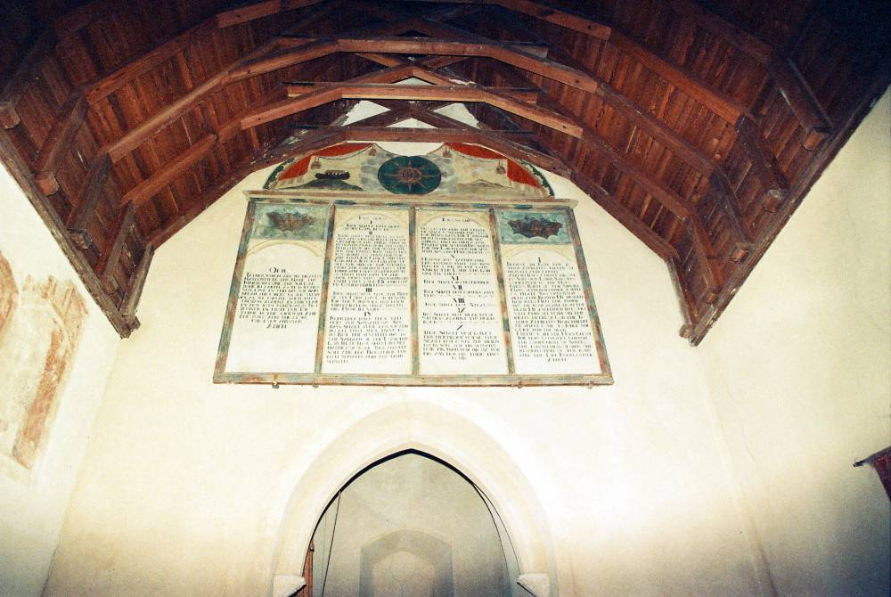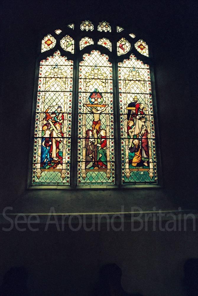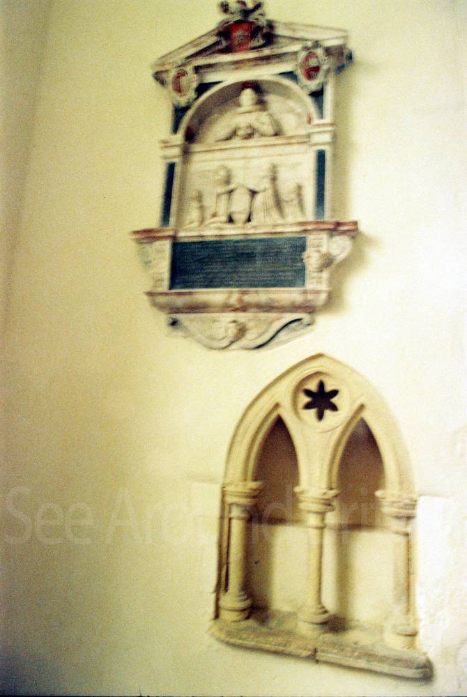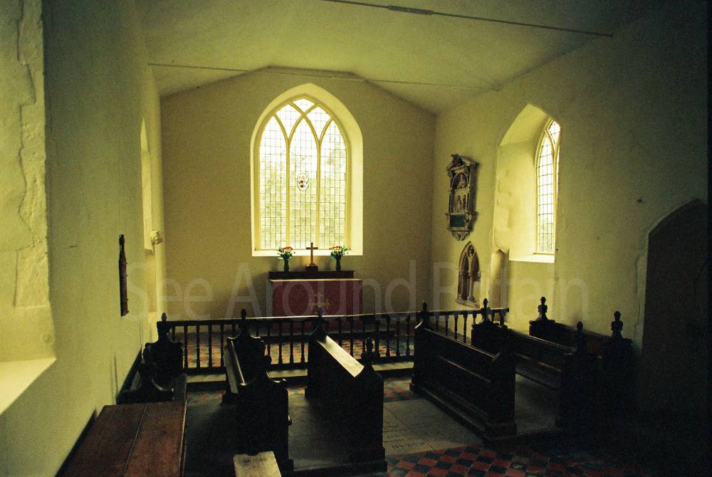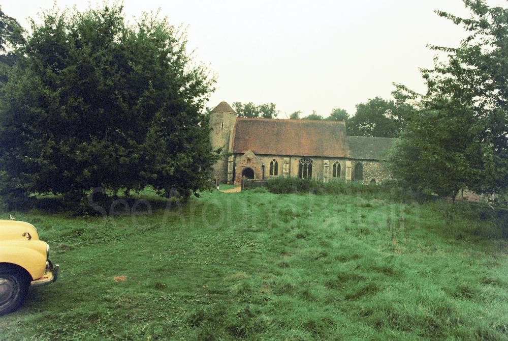 This is an isolated church set in meadows beside a farm, with an attractive Norman round tower that has a conical tiled roof. Inside, St Mary's boasts a series of beautiful fourteenth-century wall paintings, elegantly rendered in shades of grey and ochre depicting St Christopher and scenes from the Seven Works of Mercy, as well as the Ten Commandments. There is also a thirteenth-century font and a seventeenth-century pulpit."
