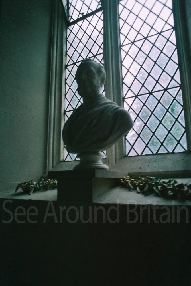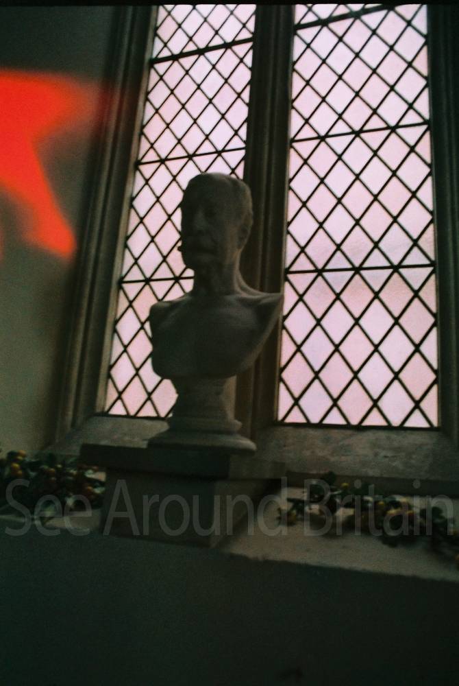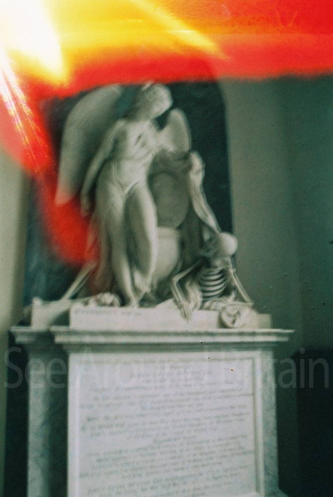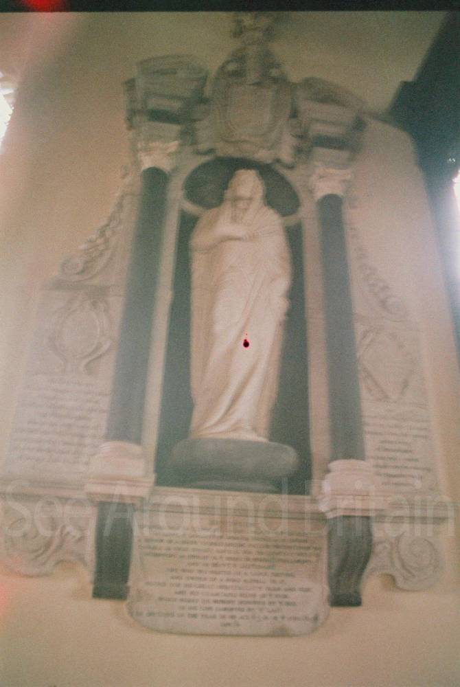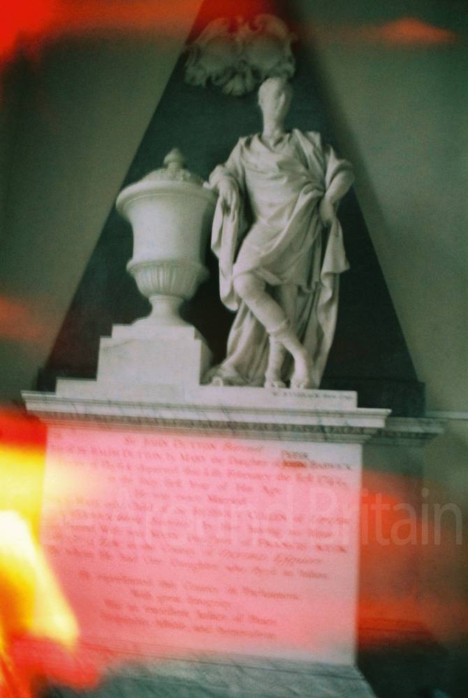 The Dutton family were patrons of St Mary Magdalene's from 1617 to 1961, and there are several monuments to the family in the church. To the left of the altar is a memorial to James Lennox Dutton by Richard Westmacott the Elder, dated 1791. It depicts an angel trampling the hideous figure of death. Opposite this is a sculture of Sir John Dutton in Roman costume. Note the error and correction made by the stonemason! "