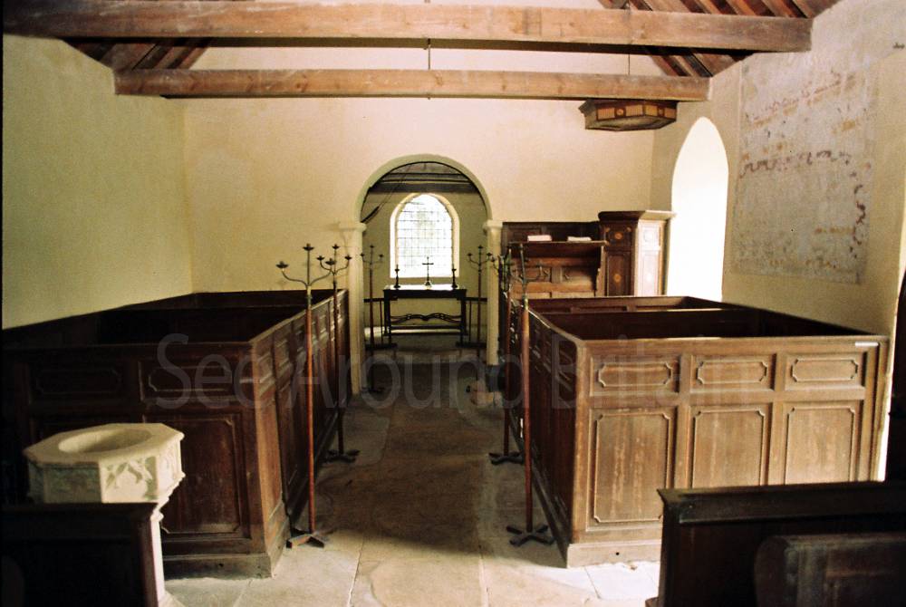 The porch entrance has a step-down onto an uneven flagstone floor within the nave.
