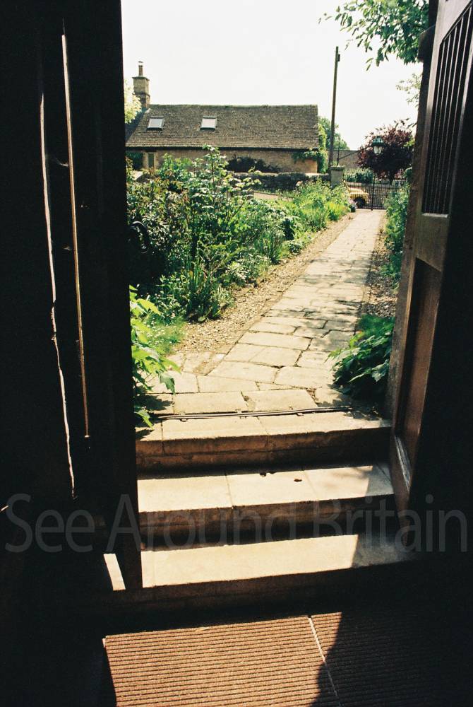 Flag stone path from church gate to front door, which has 3 steps down into the church.