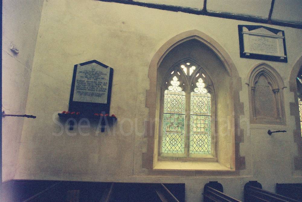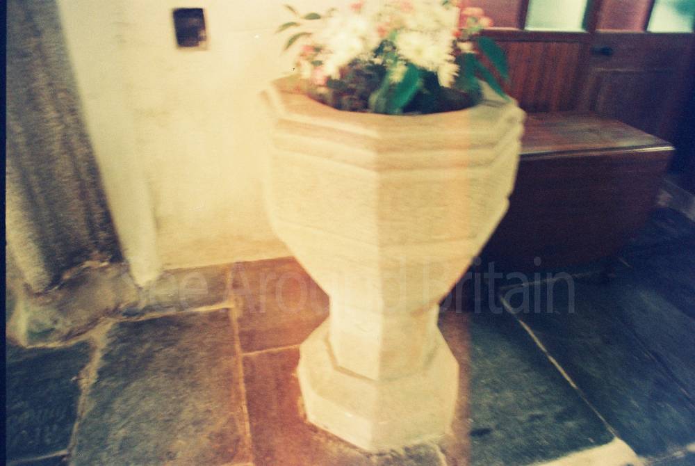 The interior includes early screens and the moulded octagonal granite font is dated 1662,[1] but the rest of the furnishings, polygonal wooden pulpit and wall tablets are Victorian.[2]"