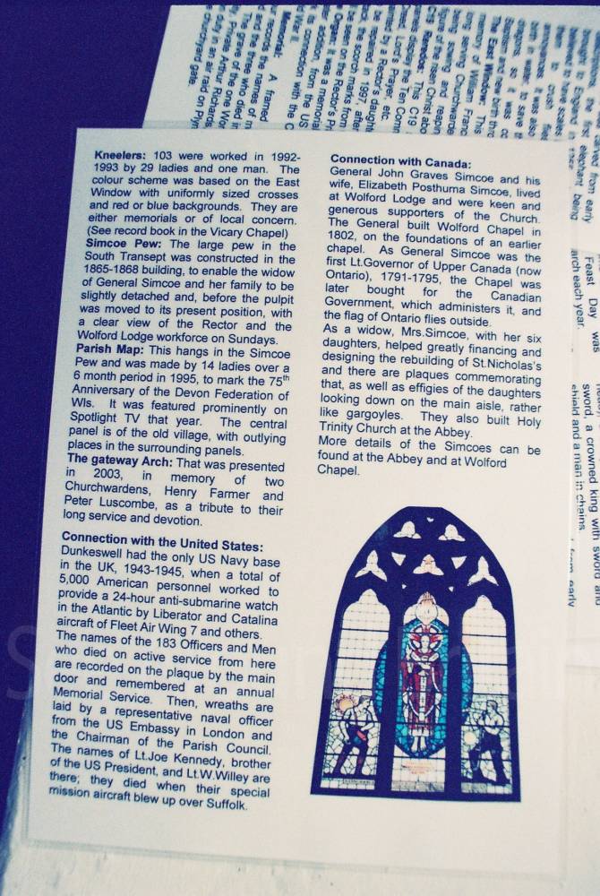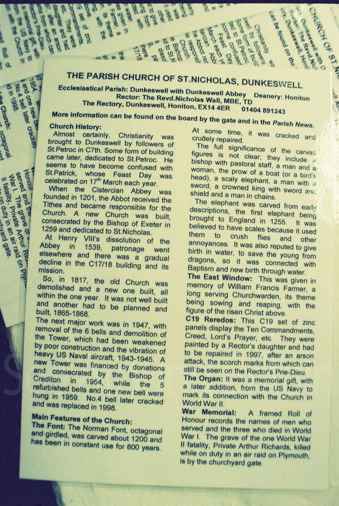 "The present Church of St Nicholas is at least the fourth on the site and was built between 1865 and 1868. Since 1868, the major change has been the replacement of the original tower, considerably and dangerously weakened by the vibration of the engines of the Dunkeswell based US Navy Liberators and Catalinas of Fleet Air Wing 7, from 1943-45. The tower had to be demolished urgently in 1947, not to be rebuilt for another seven years. In 1959, the bells were restored to the Tower. There is an eight sided Norman font with intriguing figures in the arcade of columns. A kitchen has been added and an outside WC. A loop system has been installed."