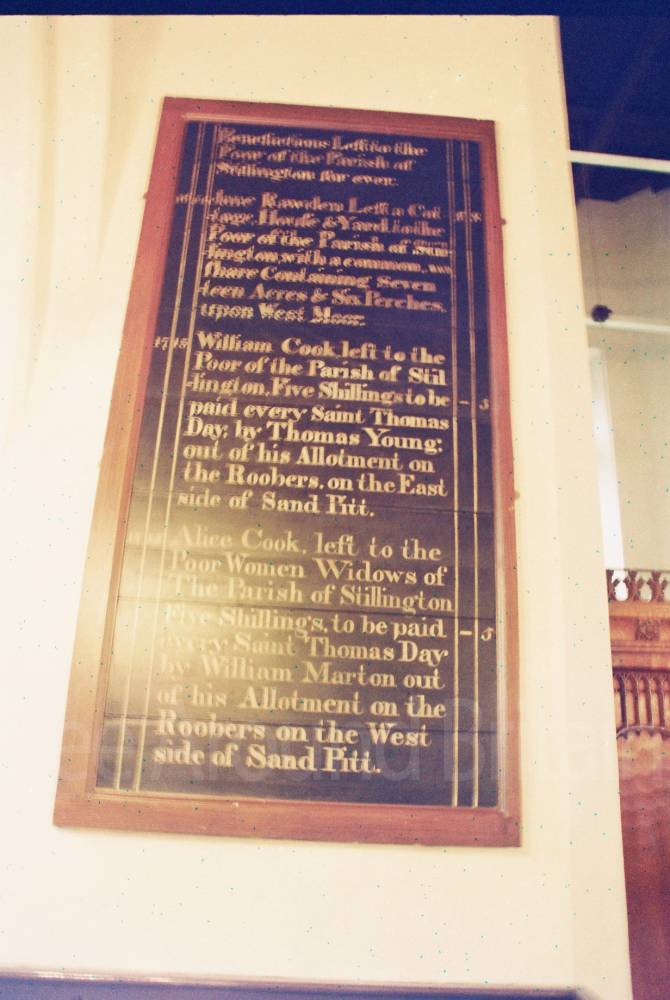 The church was extended in the 15th century and largely rebuilt in 1840. The result is a light and airy interior, despite the box pews. It has recently again been refurbished. There are memorials to the Croft family, of the former Stillington Hall, and a previous vicar was Lawrence Sterne, of Tristram Shandy fame. Some of the furniture is by Robert 'mouseman' Thomson of Kilburn.