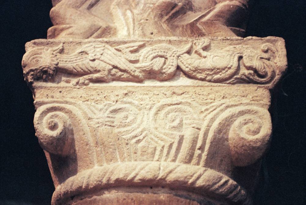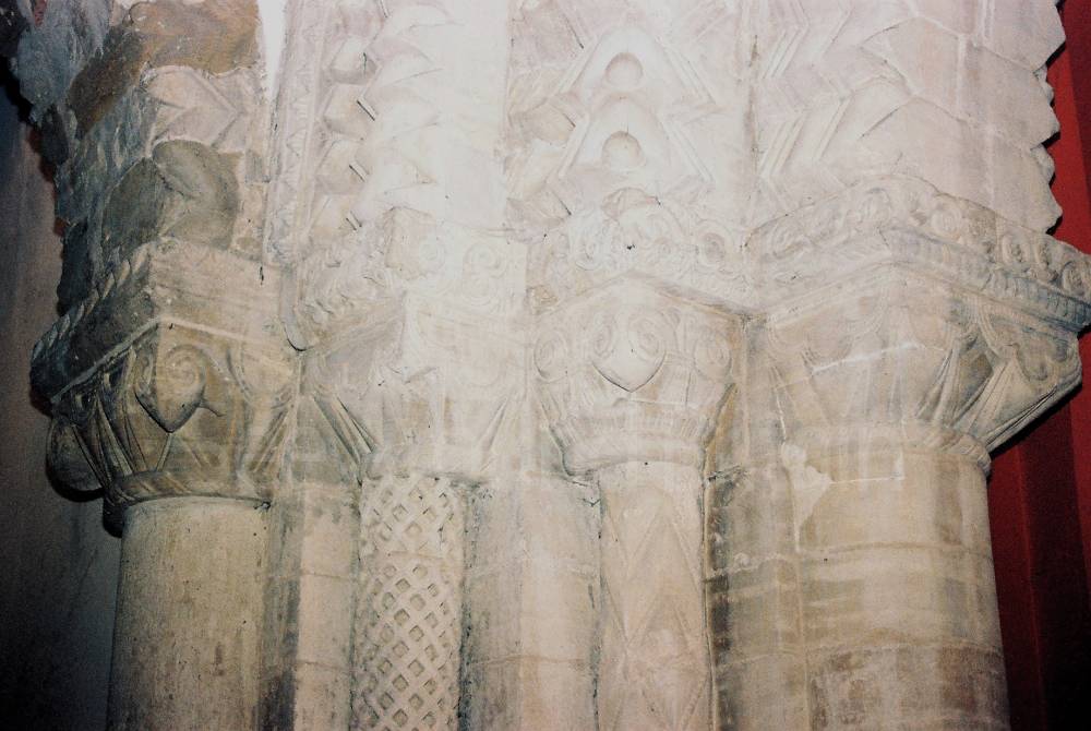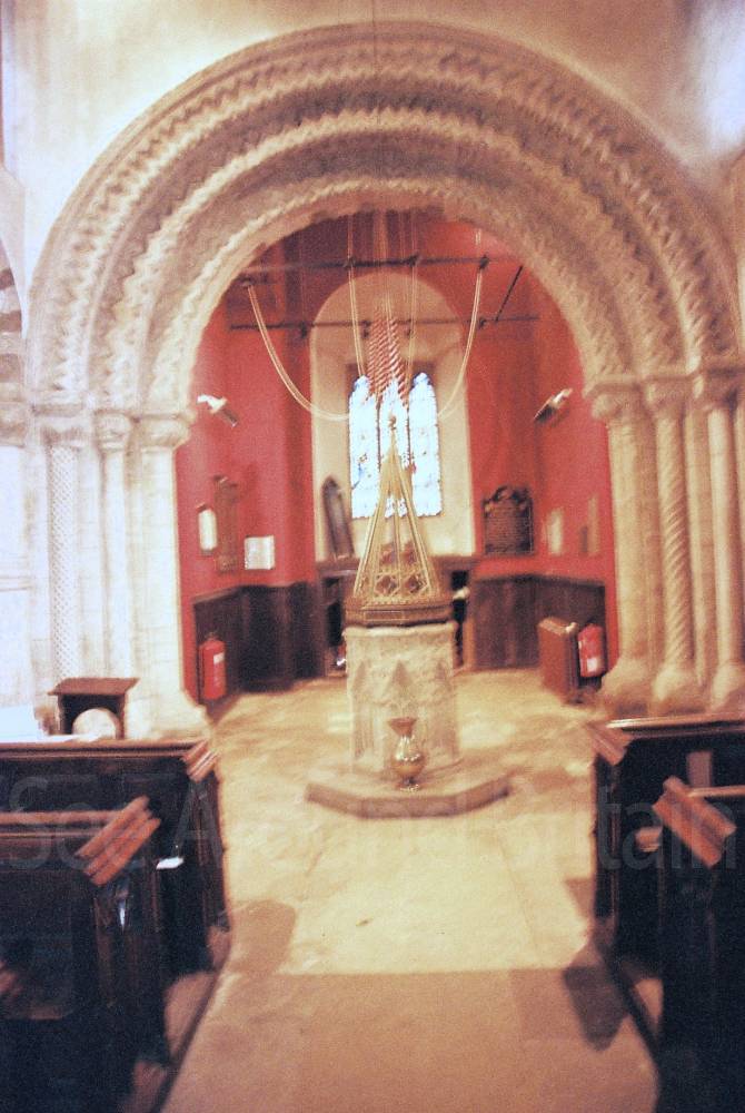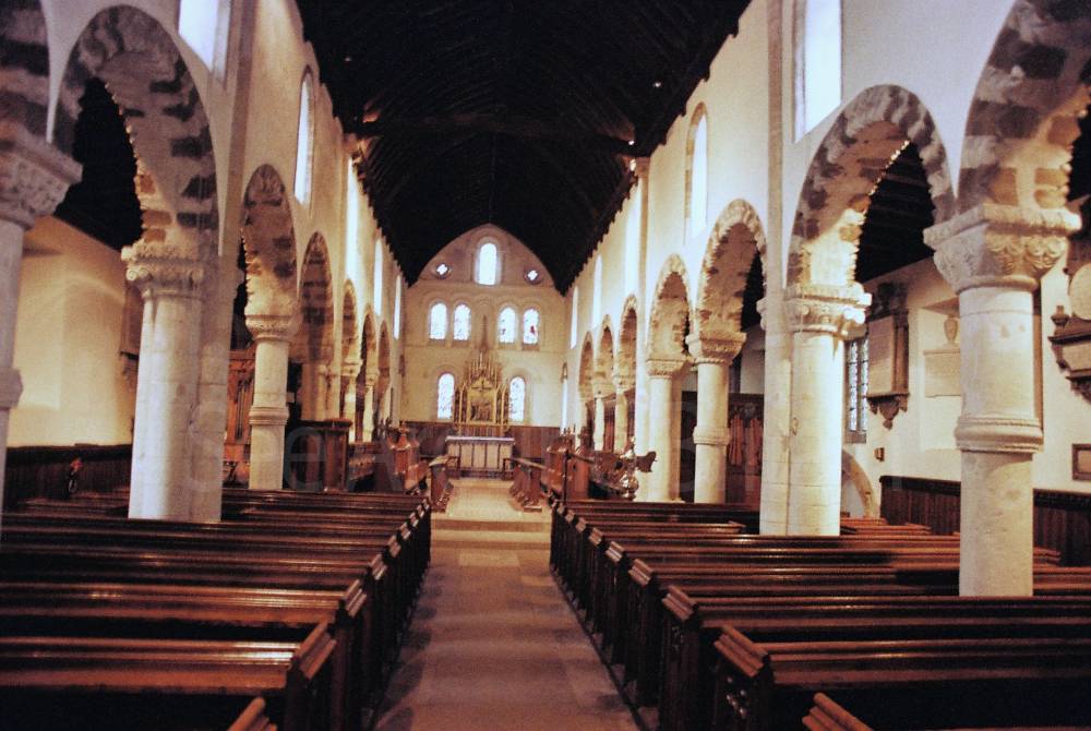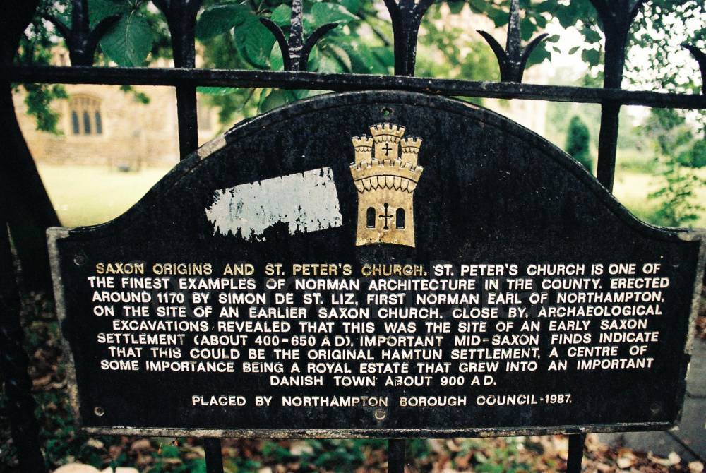 "St Peter's stands in a pretty grass churchyard in Northampton town centre, beside the buried remains of a Saxon palace. This 900-year-old Norman church is filled with glorious carved treasures. Inside, great Norman arches of plain and banded stone rise and flow with zig-zag waves.