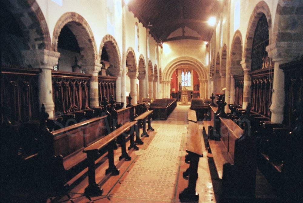 Outside, strange half-human faces glare out from under the eaves, together with cruder, timeworn figures. There are other delights to be found include the fourteenth-century font, a twelfth-century grave slab with astonishingly clear relief carving and some fine Victorian stained glass".