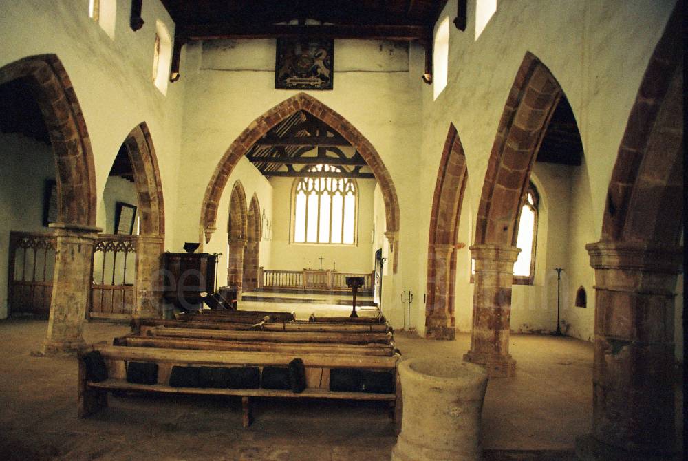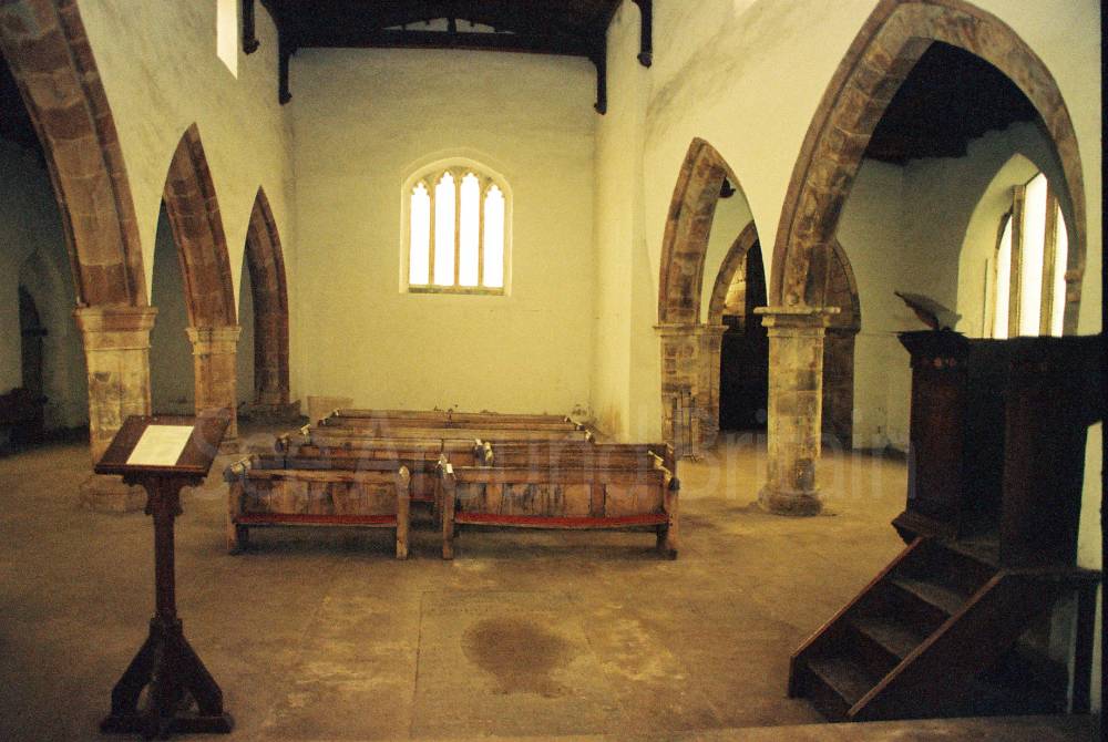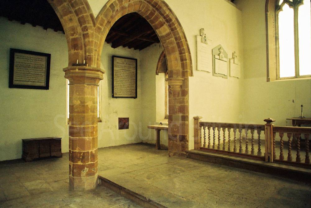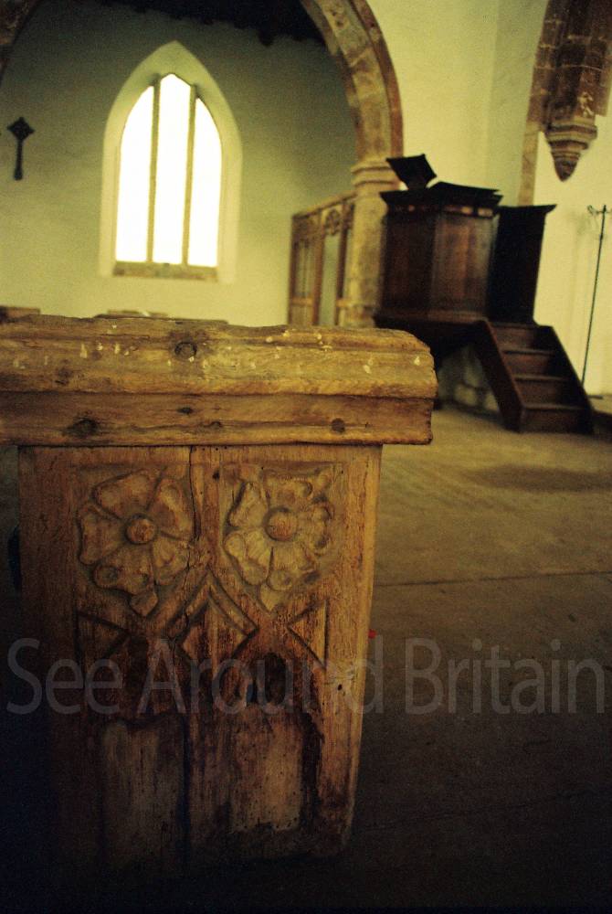 "This remote medieval church sprawls across its rough-tufted churchyard, the sole survivor of the lost village of Wolfhampcote that lies buried to the north. Close to the church are two abandoned railways and a flourishing canal. Its crooked windows, stout buttresses and multicoloured patchwork stone give it a tough, almost brutish appearance, but inside it is ordered and serene. Limewashed walls scatter light from huge windows on the church's treasures - a beautifully carved fourteenth-century screen, a Queen Anne Royal Arms, a Victorian Hood mausoleum and a collection of oak benches. The beamed roof of the chancel is a rustic marvel."