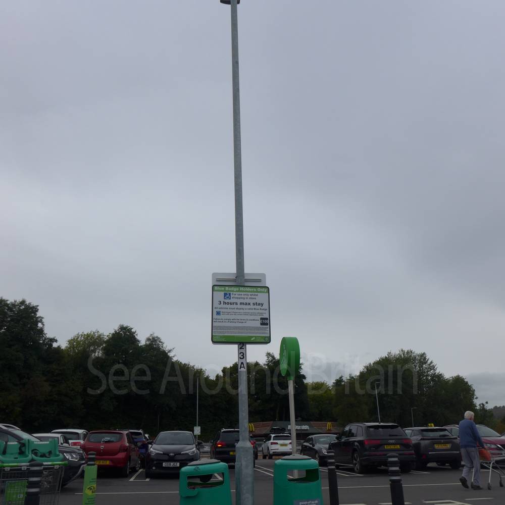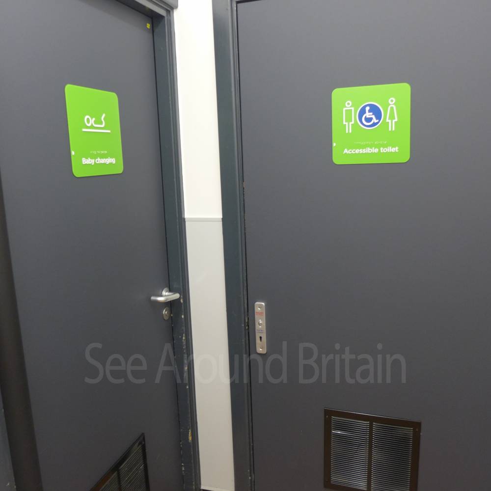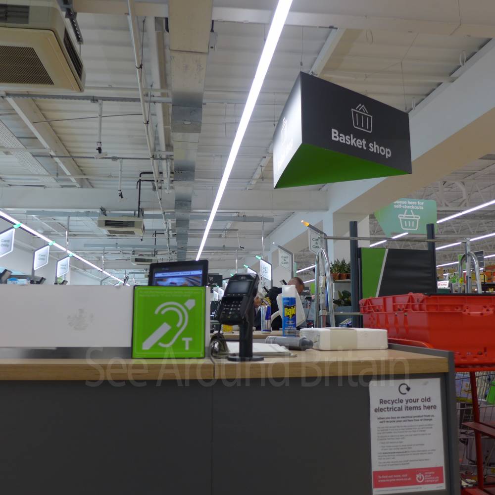 The store has its own car parking with disabled parking bays. The ground is tarmac and even. Assistance dogs are welcome. There is an induction loop and braille service available. Wheelchair trolleys are available and there is a wide check-out with portable chip and pin card machine. The café has allergy information. Both the supermarket and petrol station have automatic doors. Inside the supermarket is both an elevator/lift and a flat escalator.