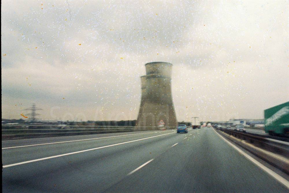 Tinsley Viaduct and the cooling towers of the old Blackburn Meadows coal-fired power station before their demolition, Sheffield, South Yorkshire