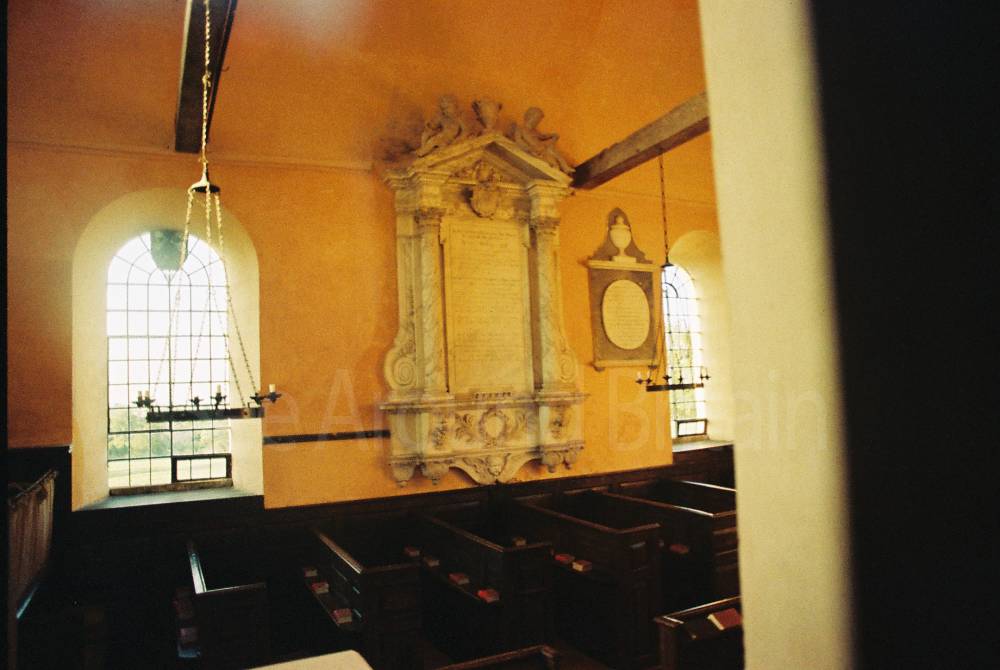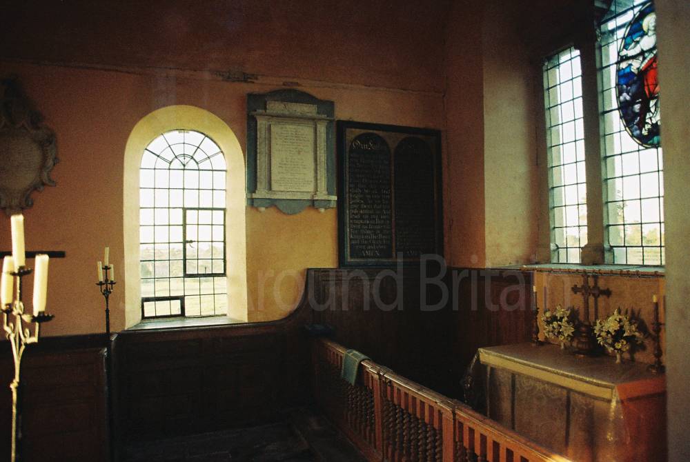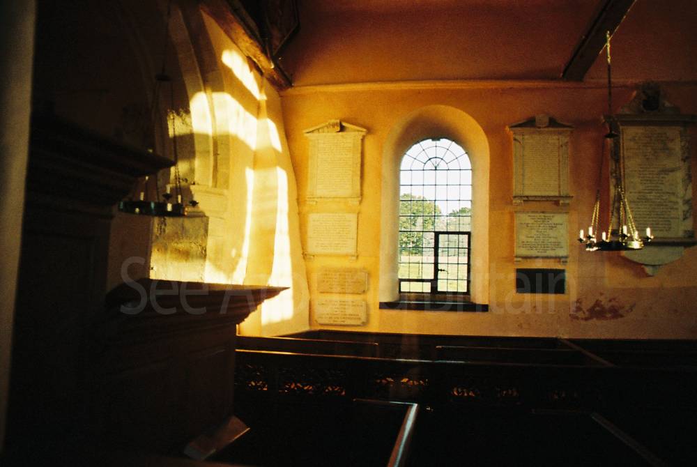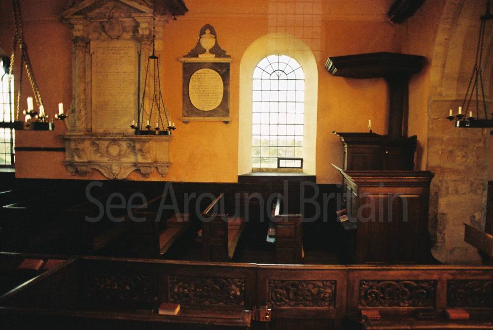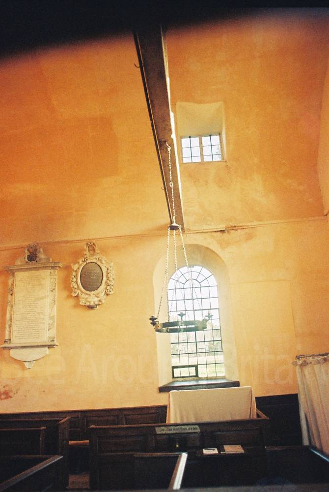 The altar table, altar rail, box pews, pulpit, reading desk and stone font date from the 1730s.